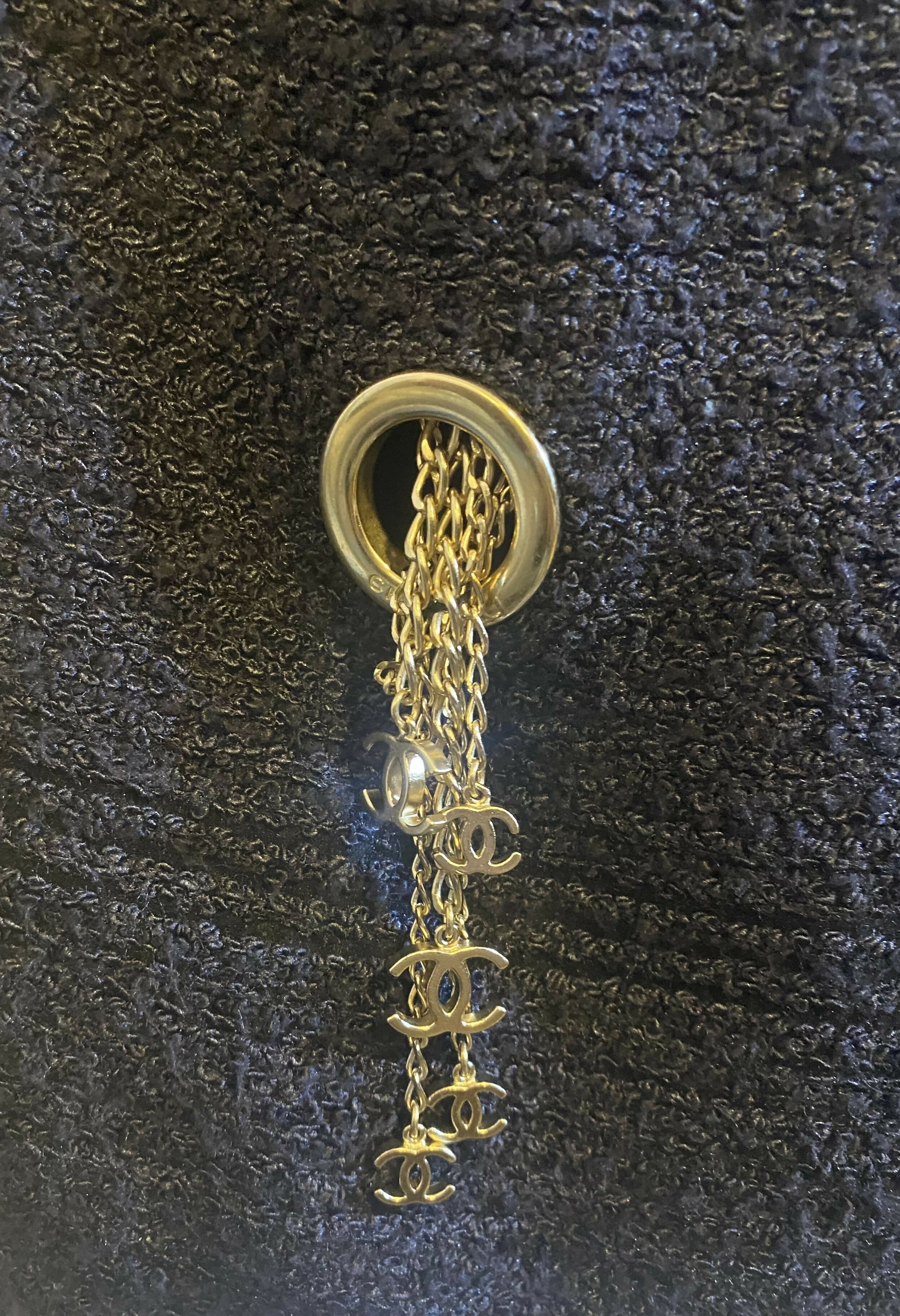 Black and Gold Unique Vintage Tweed dress with a total of 11 CC logo gold draped chains at front, chain-link trim at sleeves, invisible back zip CC closure and silk lining. There is a Jewelry Clasp so you can adjust the chains in various designs.