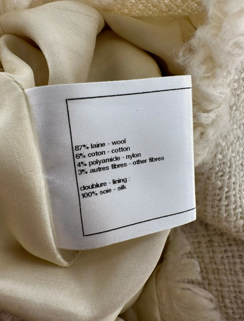 Ivory Micro Pearl beaded tweed fringe with ecru and black wool Boucle tassels, CC metal logo charm at waist, tonal silk lining.