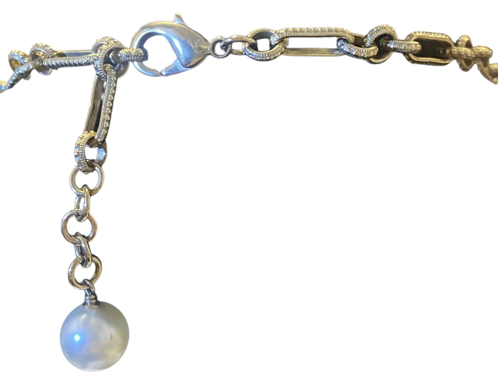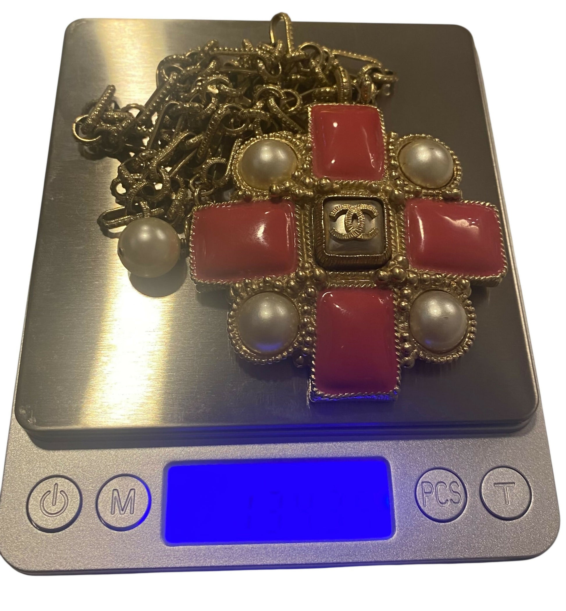 Superb Chanel XL Pendant Necklace with a splendid bright pink coral poured glass Maltese cross adornment. It is solid and heavy with a rich look. Gold Metal with Grey Center and Gold Center CC. Adorned with Pearls Around.