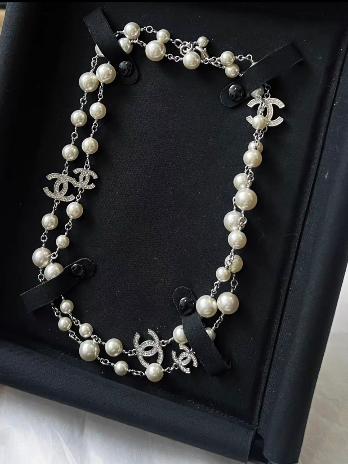 Introducing the ultimate accessory for the sophisticated fashionista - the Chanel 19 CC Crystal Pearl Long Logo Necklace. Featuring a delicate combination of crystals and pearls, this elegant necklace boasts the iconic Chanel logo for a touch of luxury. Elevate any outfit with this timeless piece that exudes elegance and exclusivity.