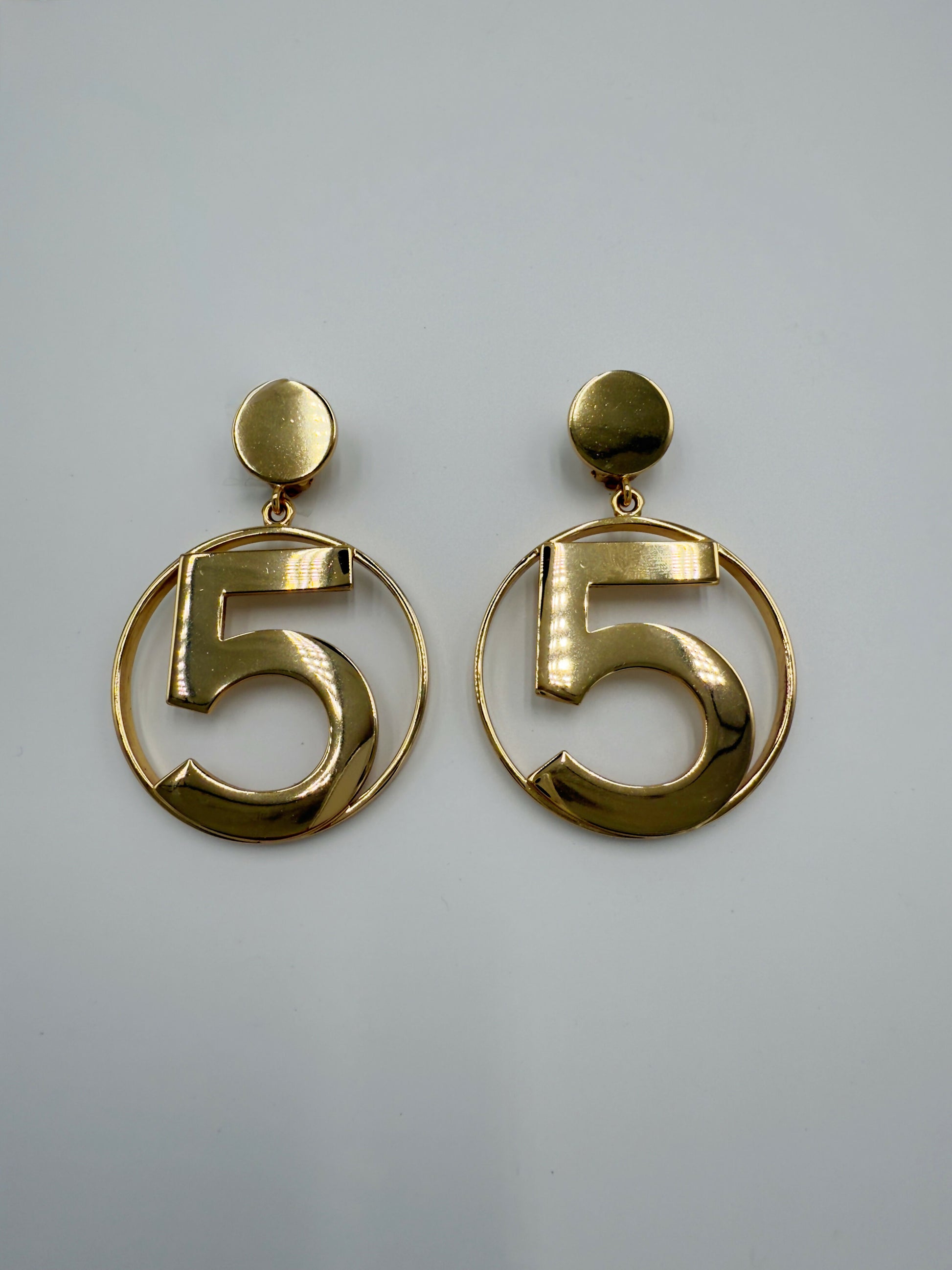 Statement gold-plated dangle earrings featuring the iconic No.5 within an open circle design. A bold and collectible piece from the 1980s runway, showcasing Chanel’s timeless allure. Normal signs of wear consistent with age.