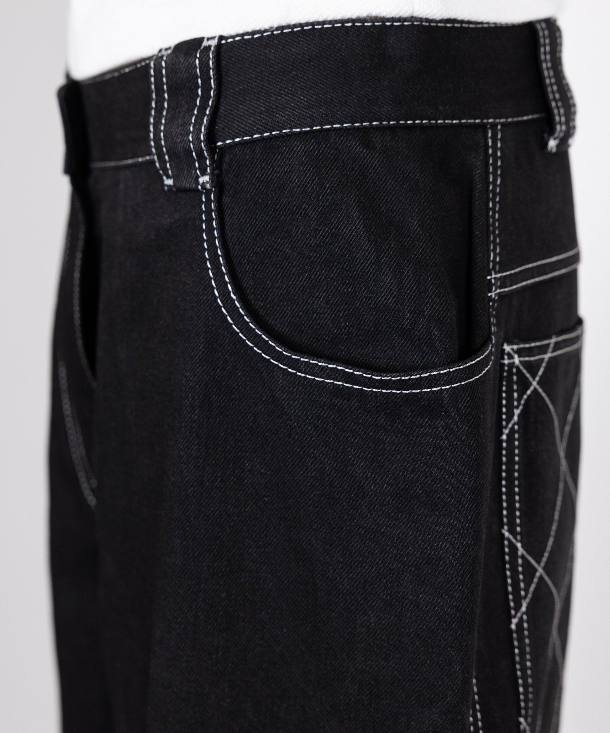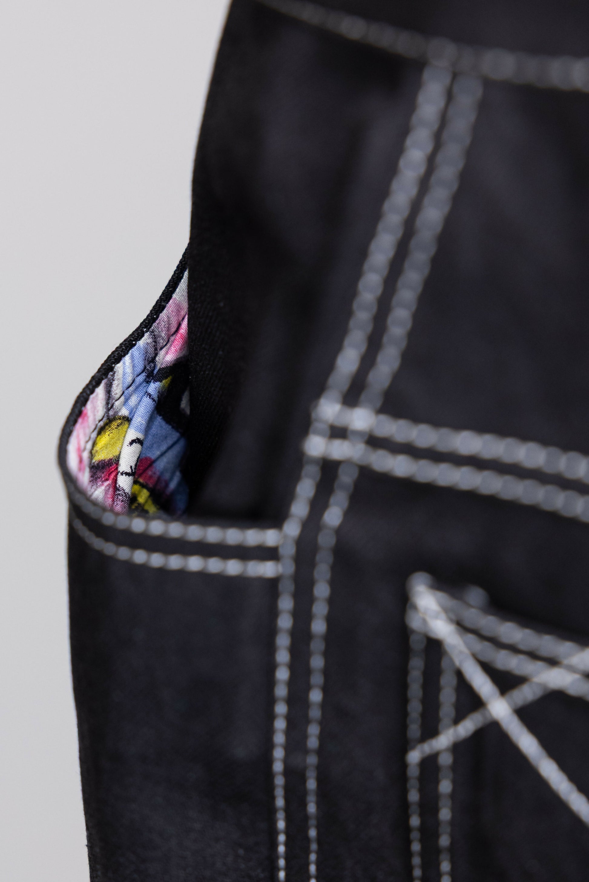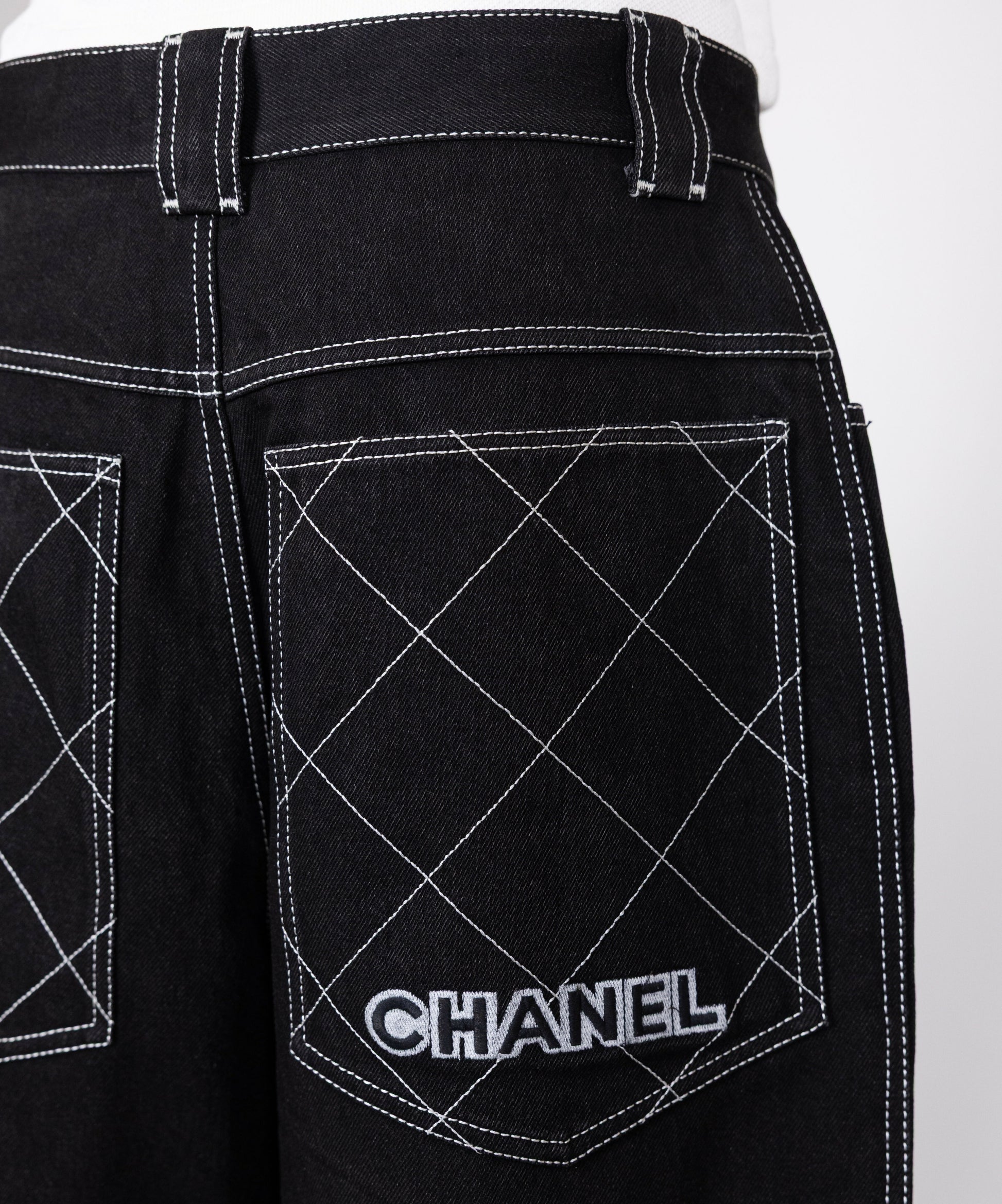 An iconic statement piece from Chanel’s 1994 runway archive, these black denim jeans are a rare vintage treasure. Featuring contrasting white diamond-quilt stitching on the oversized back pockets and the bold CHANEL logo embroidery, they embody the house’s unmistakable flair for structured glamour and cool confidence.