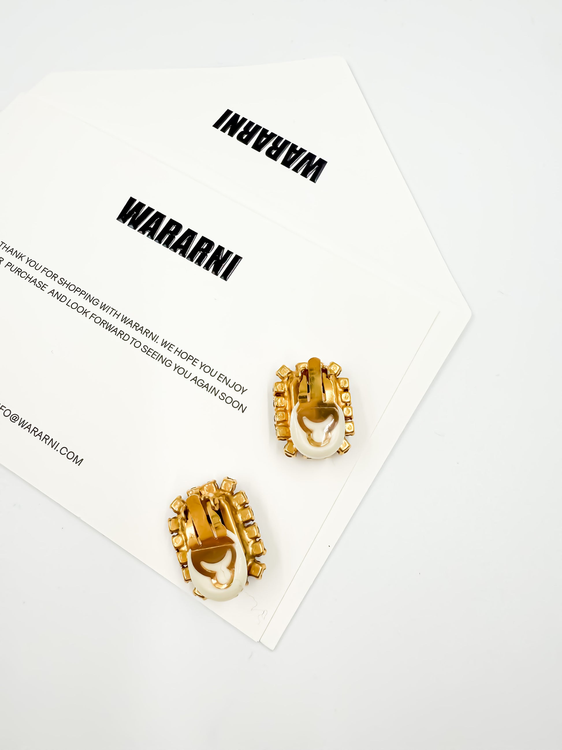 Handcrafted in gold-plated metal and set with vivid crystal rhinestones, every pair captures the era’s playful glamour — from vibrant fuchsia squares to deep ruby and sapphire teardrops. These pieces were originally designed as statement runway jewels, balancing audacity with refined Parisian craftsmanship.