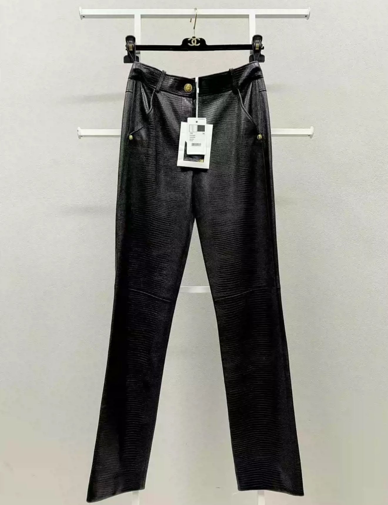 Expertly crafted from luxurious Black Iguana Embossed leather, these Chanel 19A Black Leather Pants are a must-have for any fashion-forward individual. A part of the iconic 2019 métier d’art Égyptien series, these pants exude style and sophistication. Available in size 36.