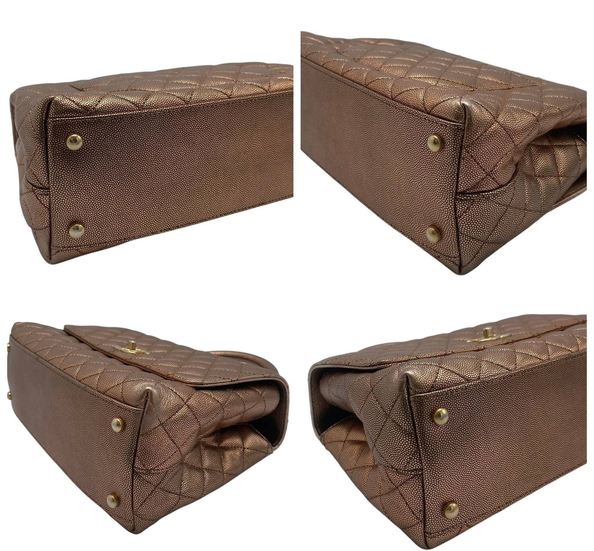 A Limited Edition, Stunning Color in Rose Gold Copper Metallic Caviar Quilted Leather. This Medium Coco Handle shoulder bag features a top handle, aged gold chain-link shoulder strap with shoulder pad, with aged gold CC turn-lock hardware. This opens the flap to a partitioned burgundy fabric interior with zipper and patch pockets. Protective Feet at Base.