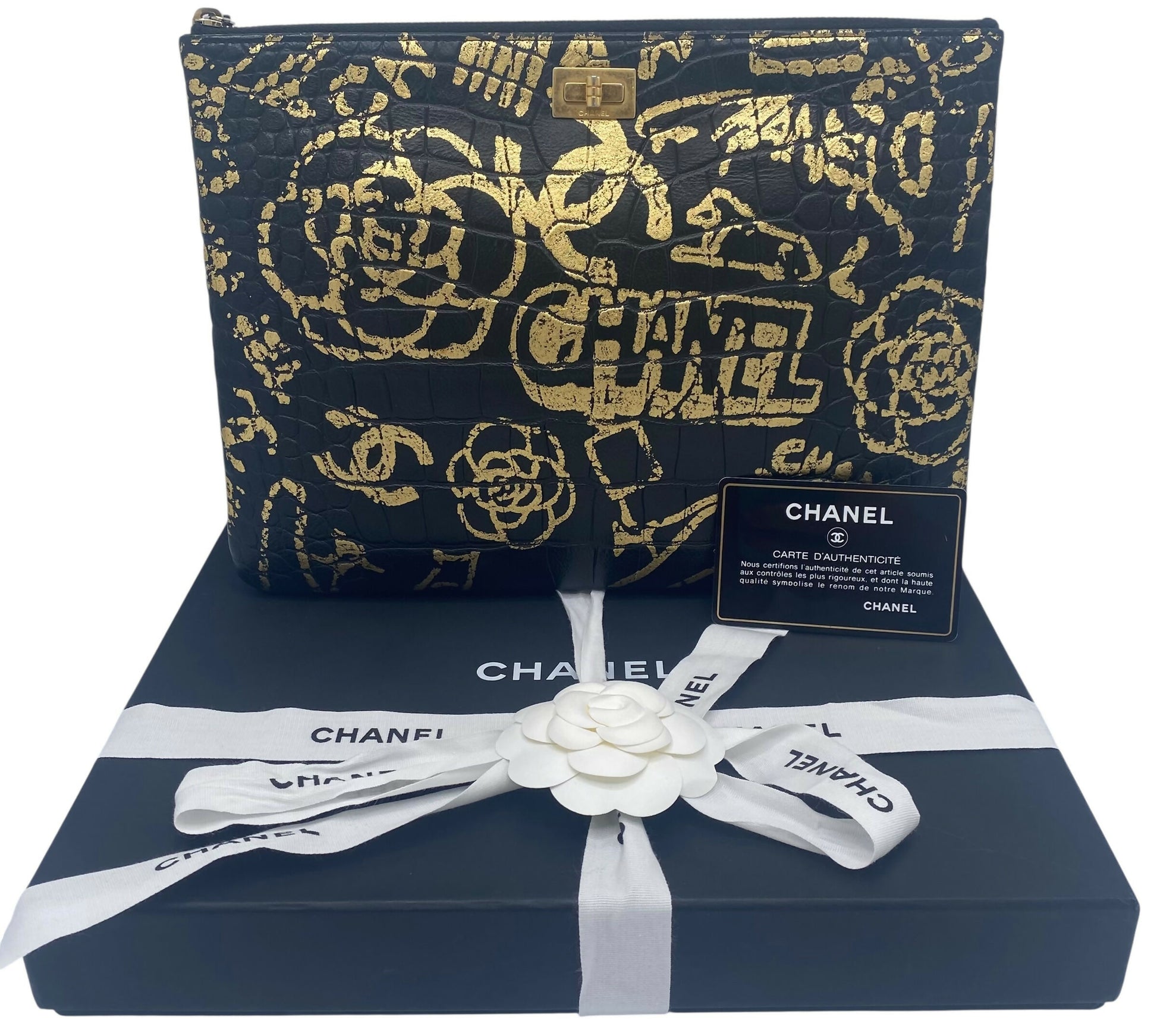 Black crocodile-embossed calfskin leather with a gold Chanel graffiti overlay and a faux mademoiselle turn-lock on the front. The top zipper opens to a black fabric interior with a zipper pocket.