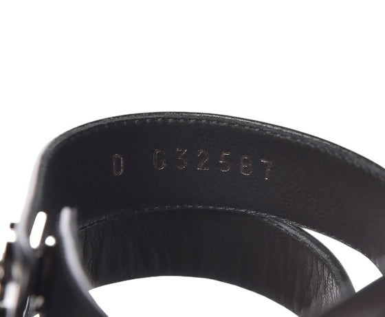These stylish sandals are crafted of calfskin leather in black. They feature a small heel and wide leather crossover straps that have mock silver CC turn locks. These are excellent slip on sandals, with a distinctive look!