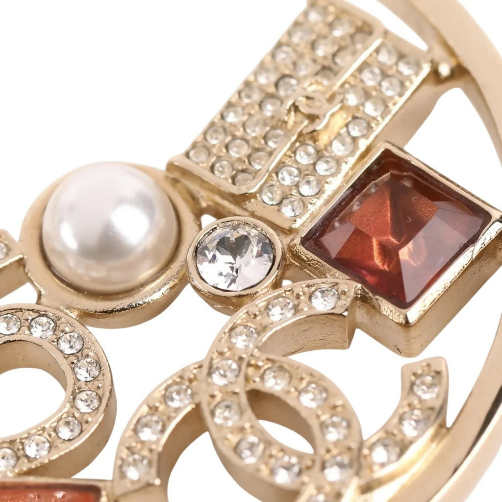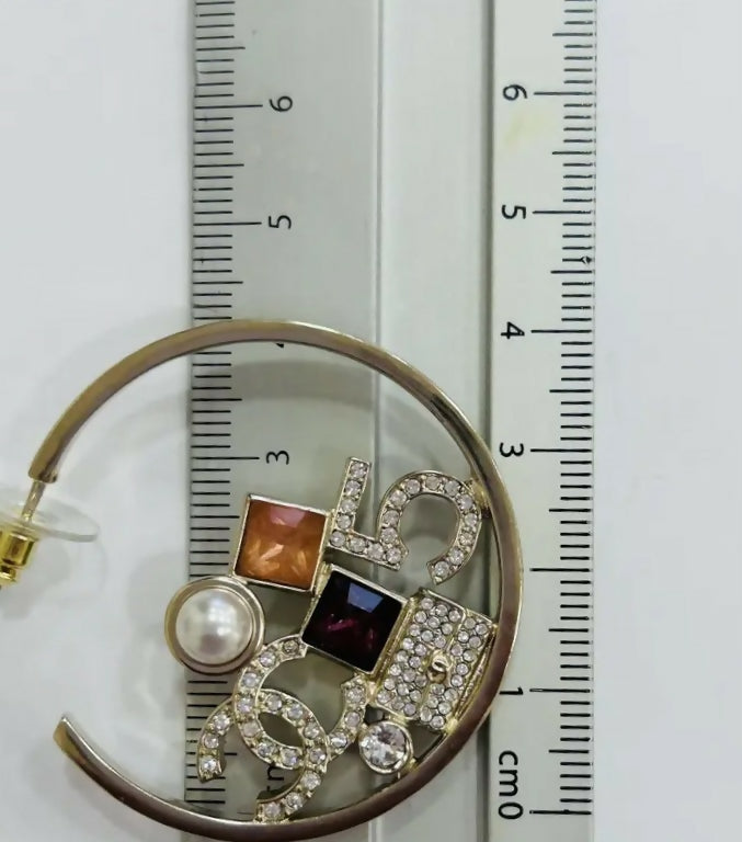 Chanel N 5 gold tone hoop earrings, with red and orange stones, pearls and rhinestones. Timeless bag and CC logo inserts set with crystals and pearls. Engaged Chanel at edge of hoop on each earring.