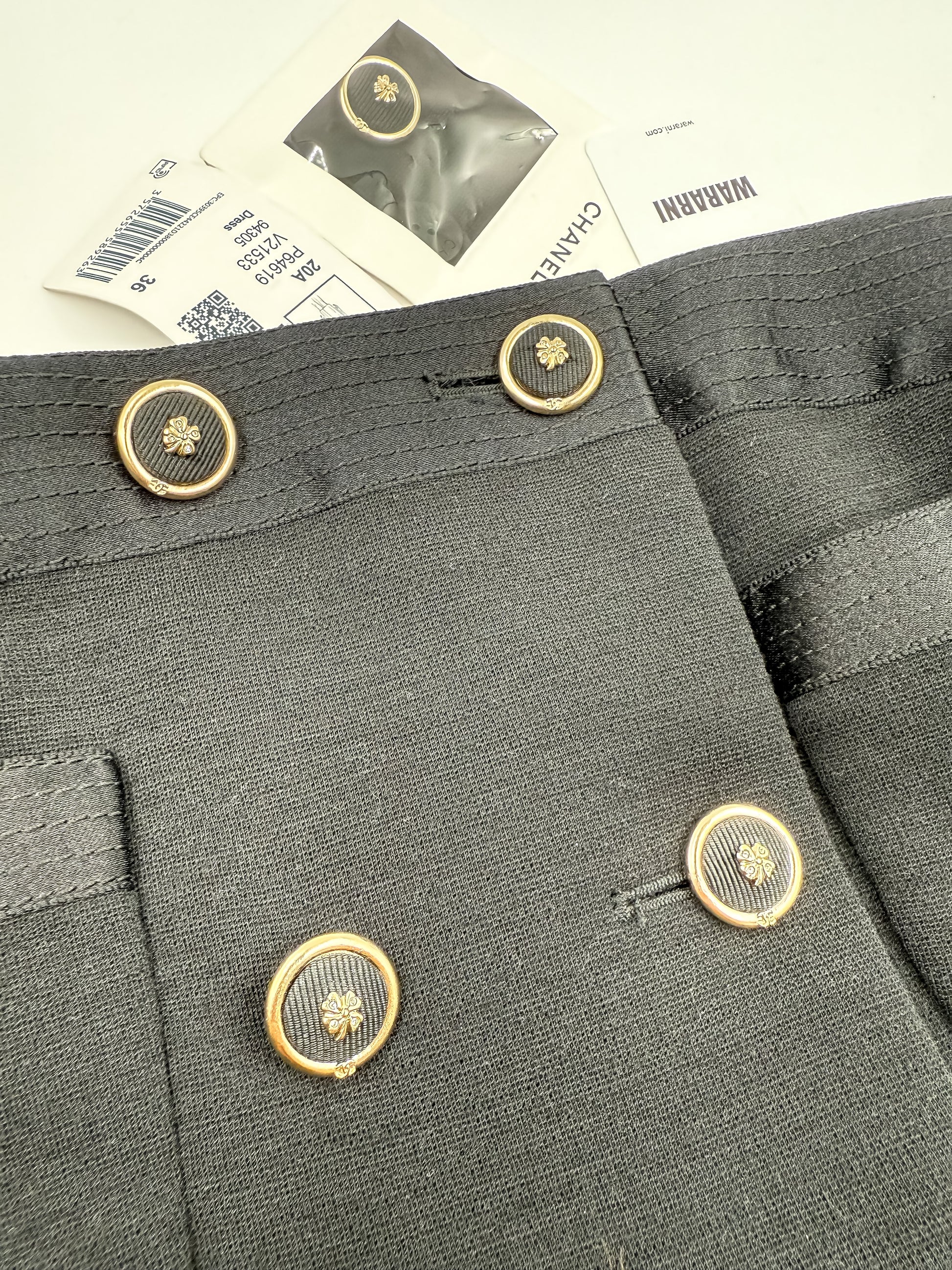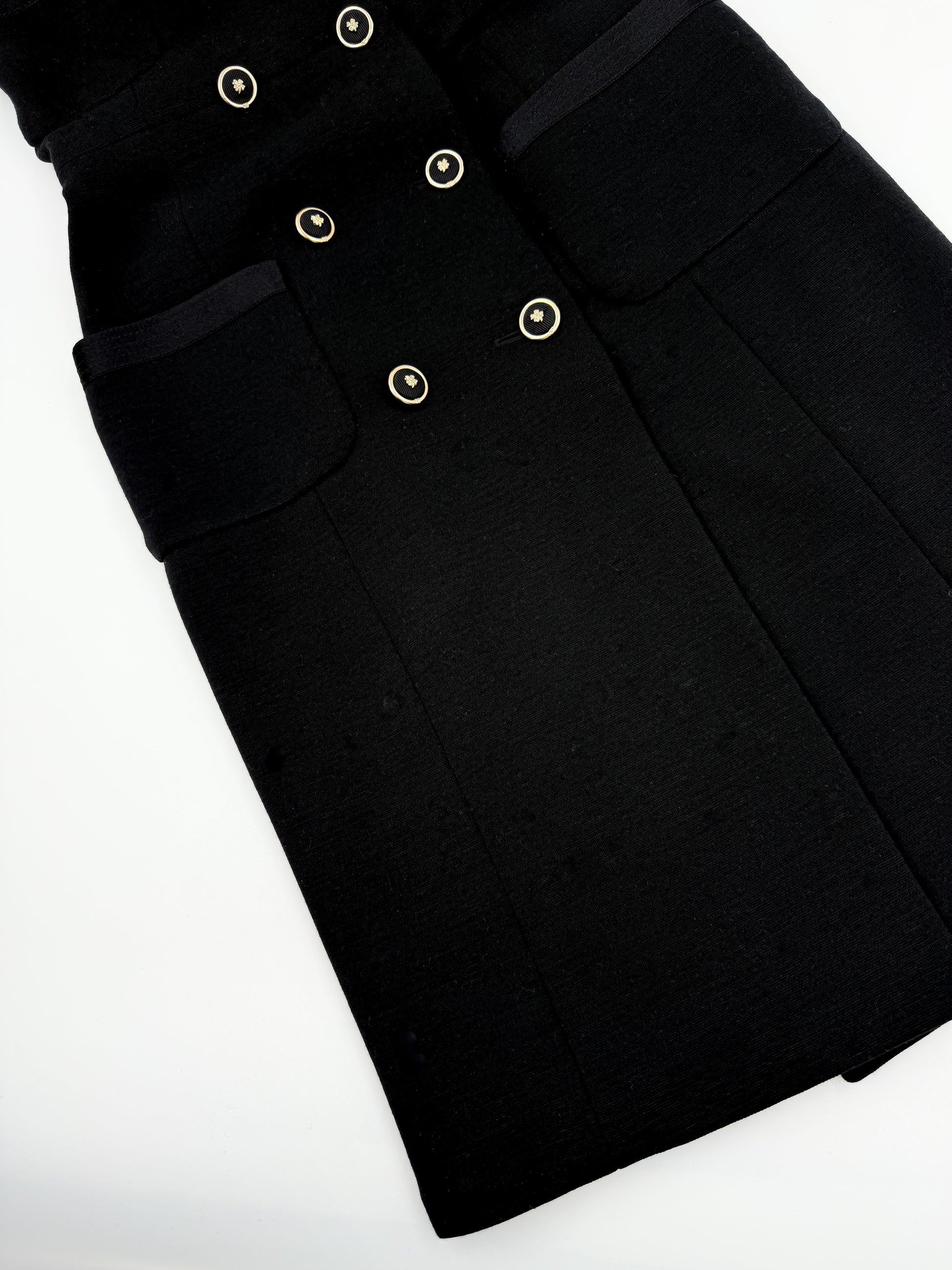 The silhouette channels CHANEL’s eternal little-black-dress legacy: sleek, structured and elegantly feminine, crafted in luxurious black wool with couture-level precision. What sets this dress apart are its extraordinary buttons—each featuring the signature CC paired with a delicate leaf, a nod to CHANEL’s long tradition of weaving lucky charms and symbolic talismans into its garments. Inspired by Gabrielle Chanel’s own superstitions, these motifs have become hallmarks of some of the maison’s most prized designs, adding both narrative depth and rarity.