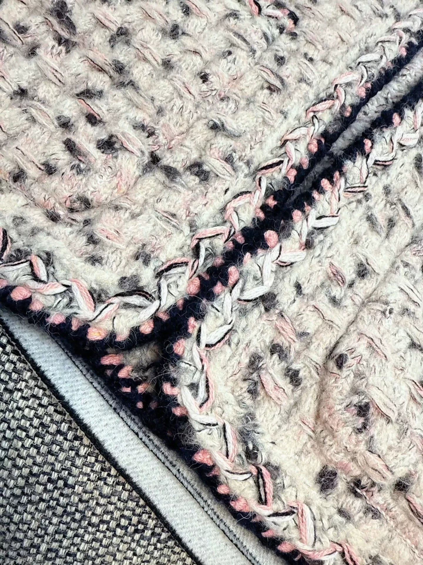 Experience luxurious style with our Chanel 21B beige pink & red tweed cardigan. This four-pocket mixed color g woven coat features a thick knitted texture in a stunning milk tea color. Available in size 38, brand new with tag. Elevate your wardrobe with timeless elegance.