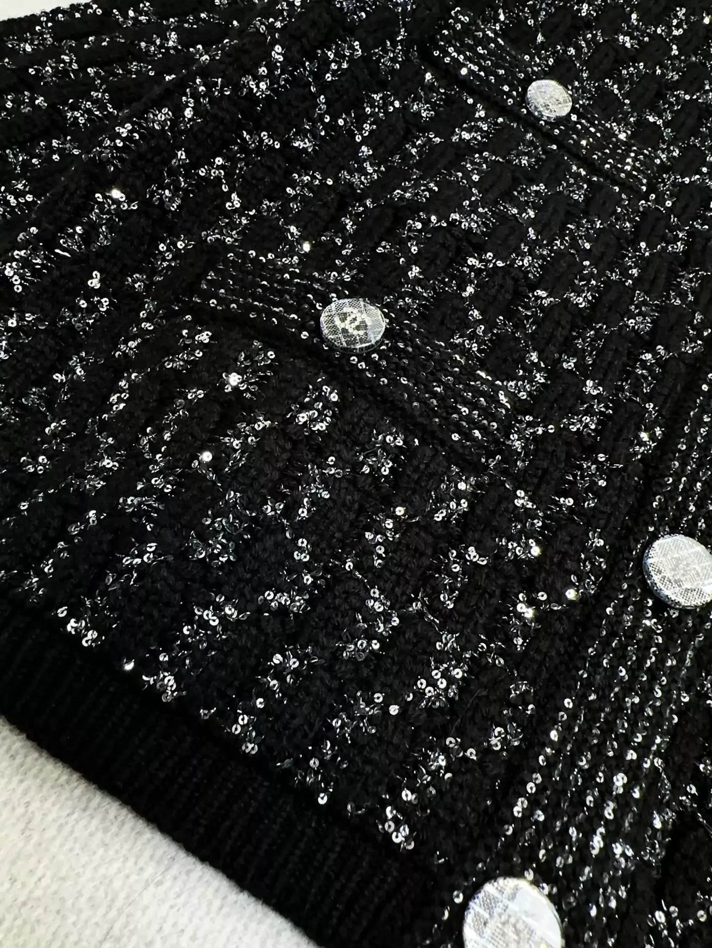 Expertly crafted by CHANEL, this black sequin knitted cardigan is a must-have for any fashion-forward individual. Its intricate design features a striking star pattern, adding a touch of glamour to any outfit. Size 38 and brand new with tag, this cardigan is the perfect addition to your wardrobe.