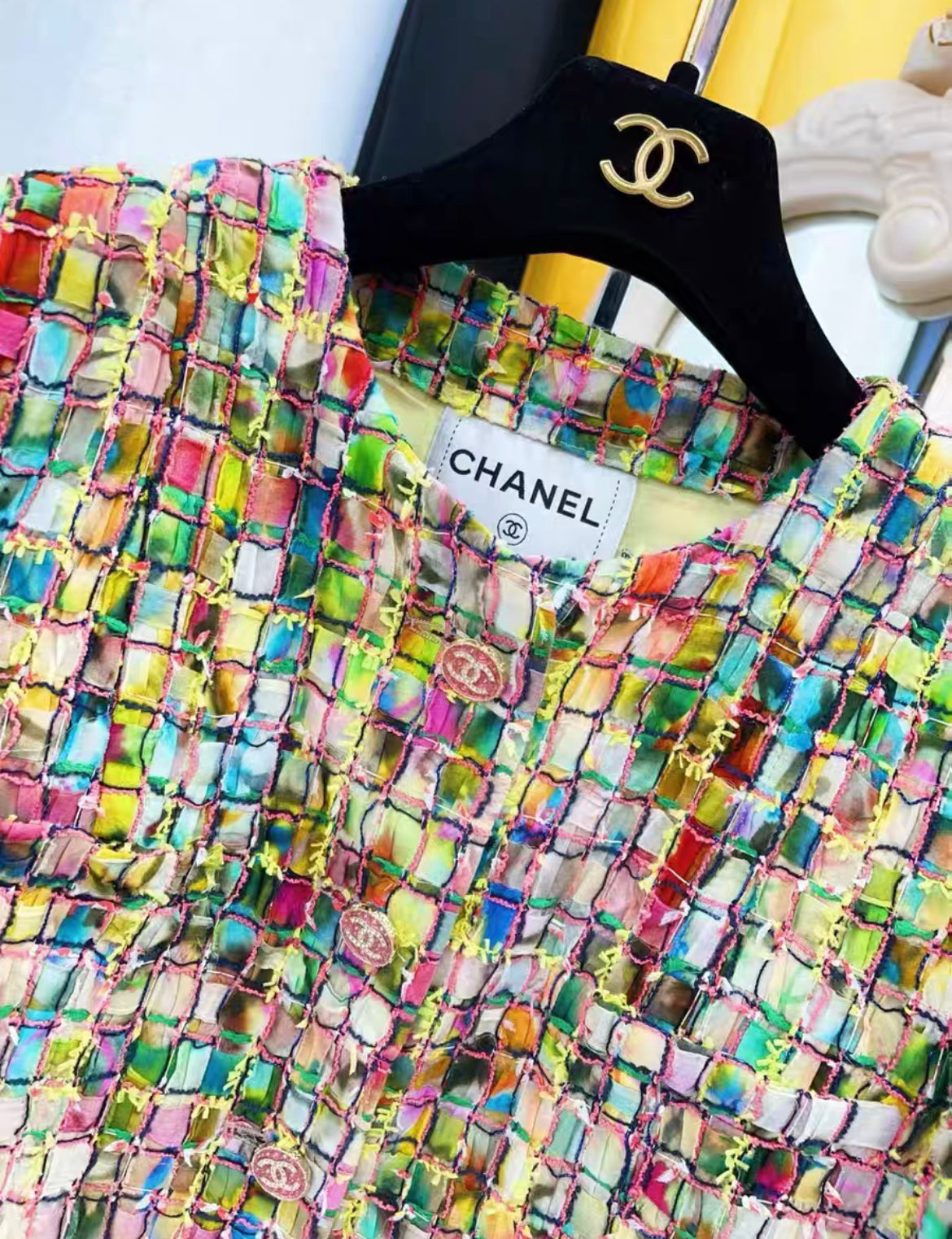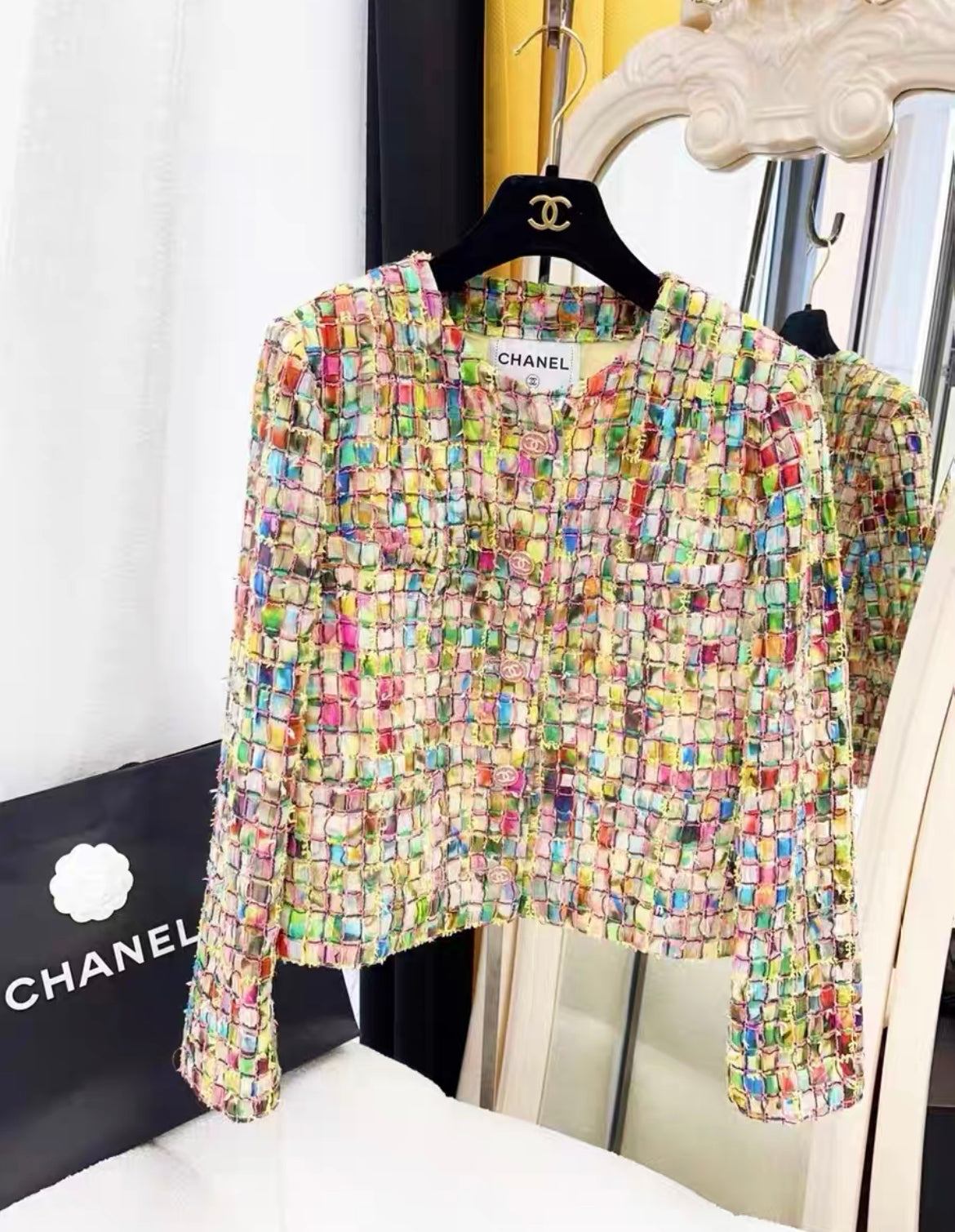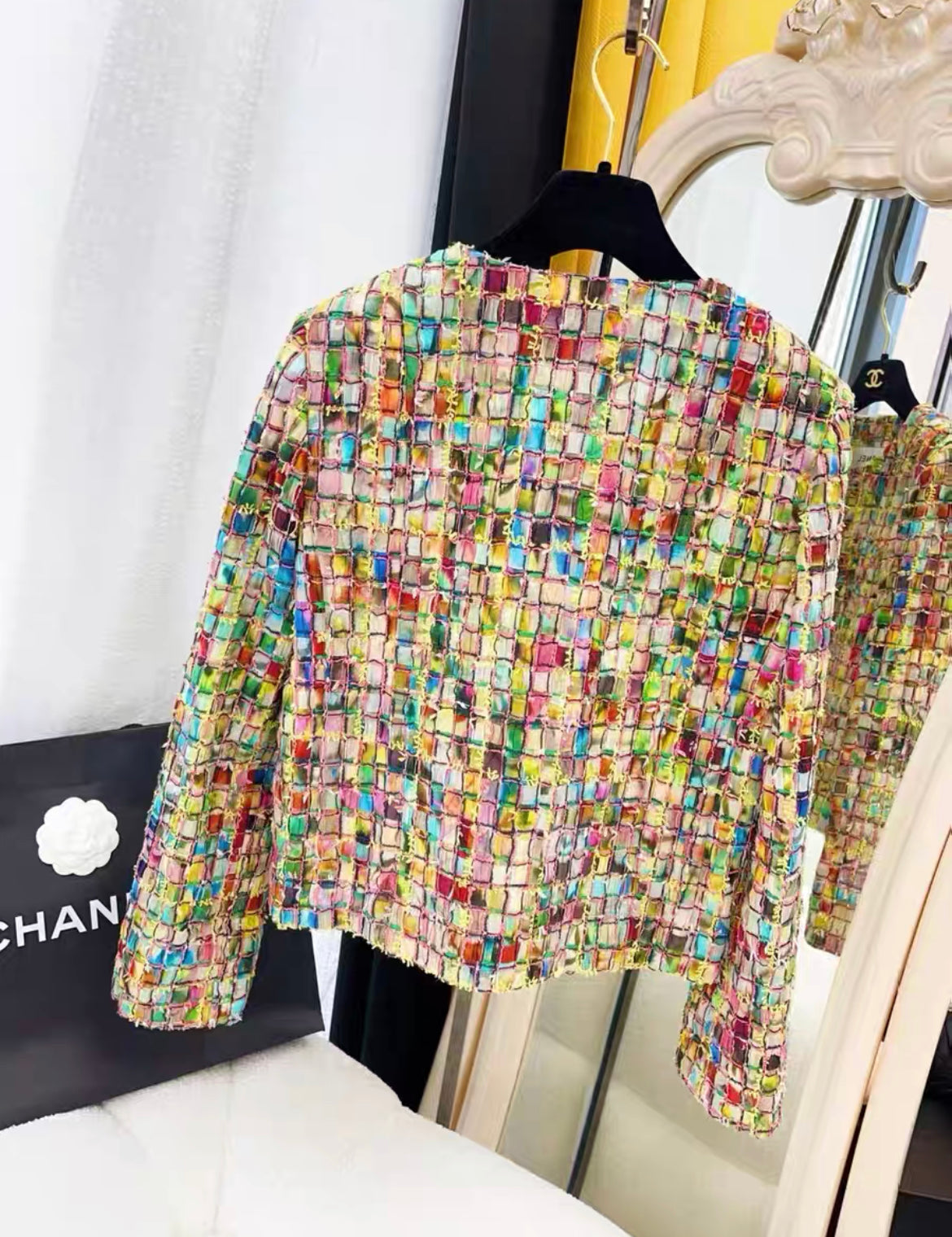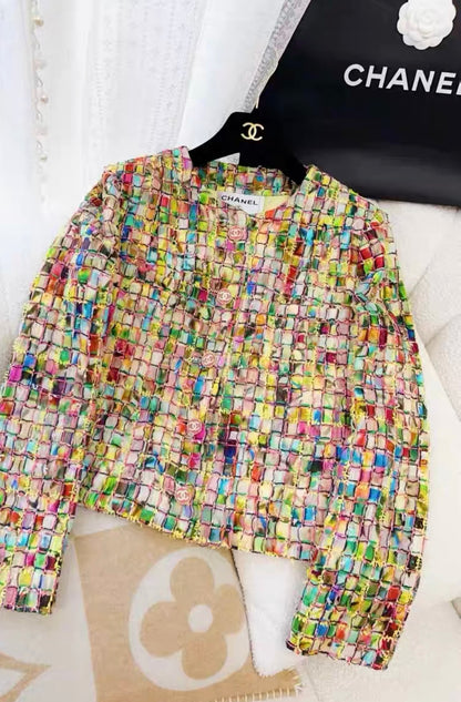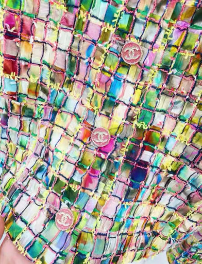 "Introducing the Chanel 21S Colorful Jacket, part of the 2021 Spring Summer Collection. This mosaic-inspired jacket adds a vibrant touch to any outfit. Perfect for adding a pop of color to your wardrobe this season."