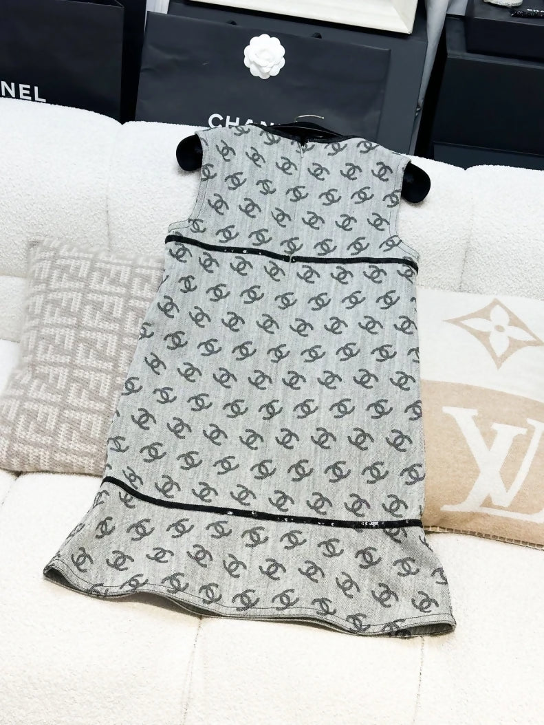 Chanel 22S grey denim dress with all-over logo and black rhinestone buttons
