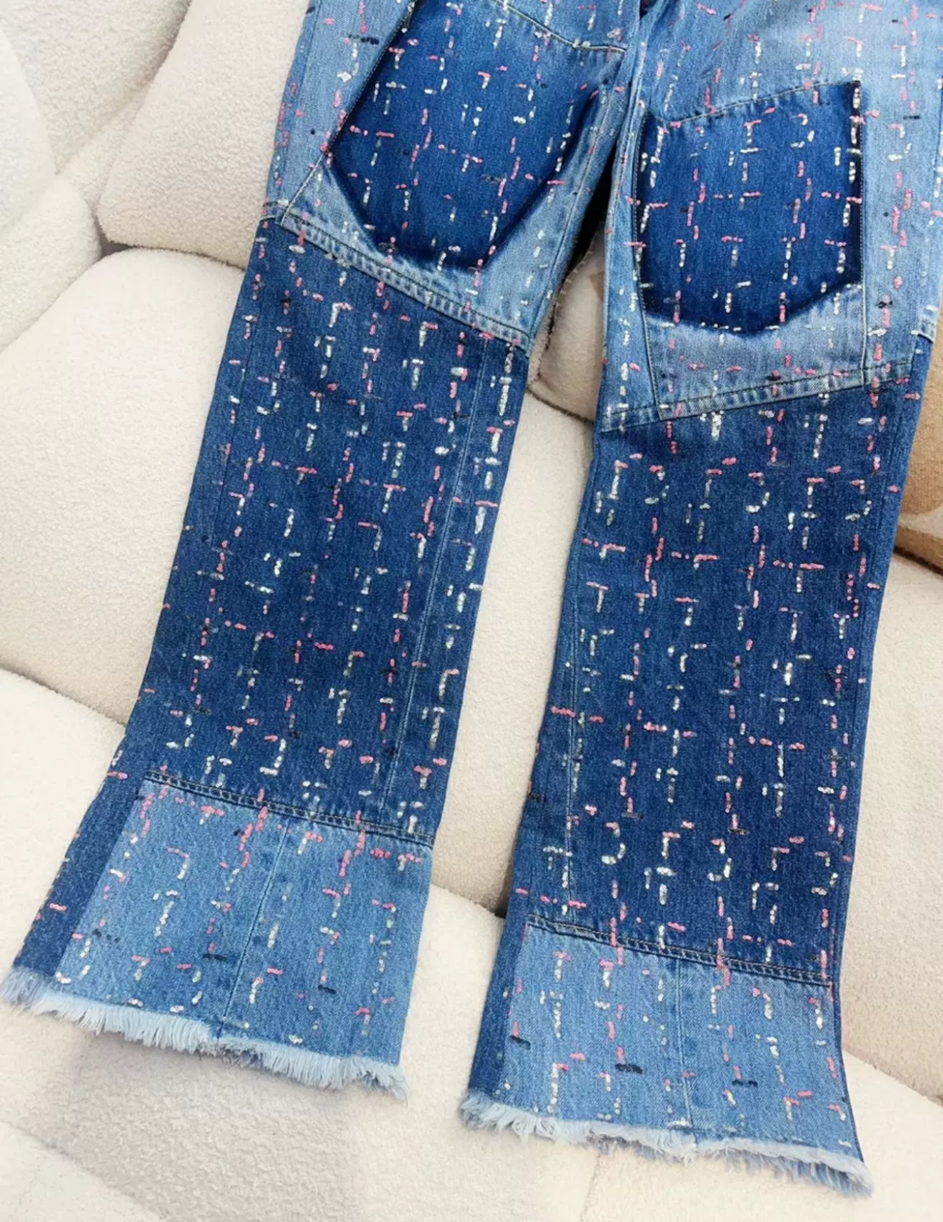 Introduce the fashion-forward Chanel 23A colourful Flare jeans in size 38 métier d’Art 2023. Featuring a chic and flattering flare style, these jeans add a pop of color to any outfit. Elevate your wardrobe with these statement jeans that showcase your unique style and taste.