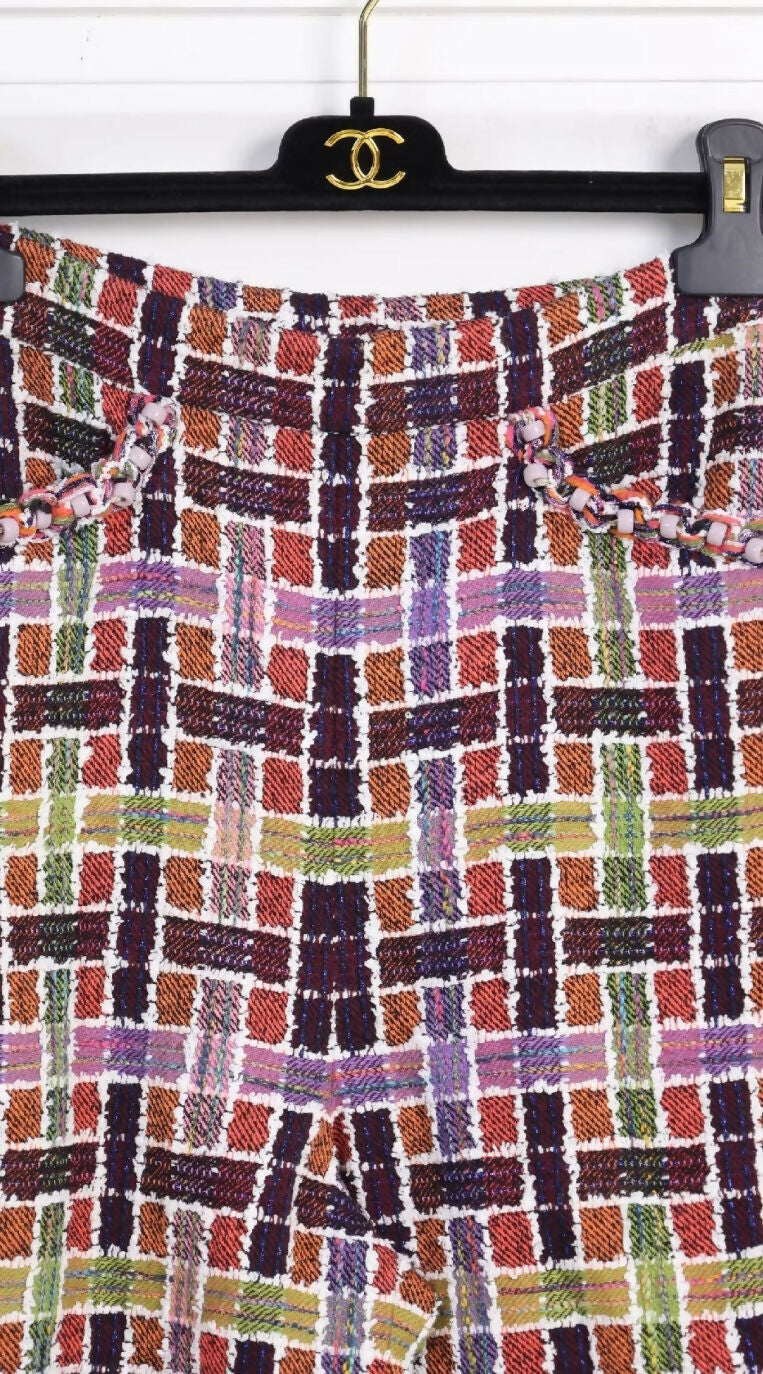 Elevate your wardrobe with the Chanel 23A Dakar Series Mosaic colourful Check Wide-Leg Pants. Made from luxurious materials, these pants are designed for both style and comfort. The unique mosaic rainbow check pattern adds a pop of color to any outfit, making a statement wherever you go. Available in size FR36.