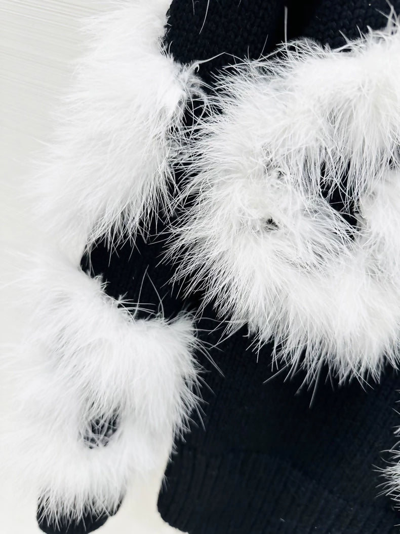 Indulge in luxury with the Chanel 23K black and white knit top. Adorned with a unique 3D feather and camellia motif, this size F36 top exudes sophistication and elegance. Perfect for any occasion, make a statement with this exquisite addition to your wardrobe.