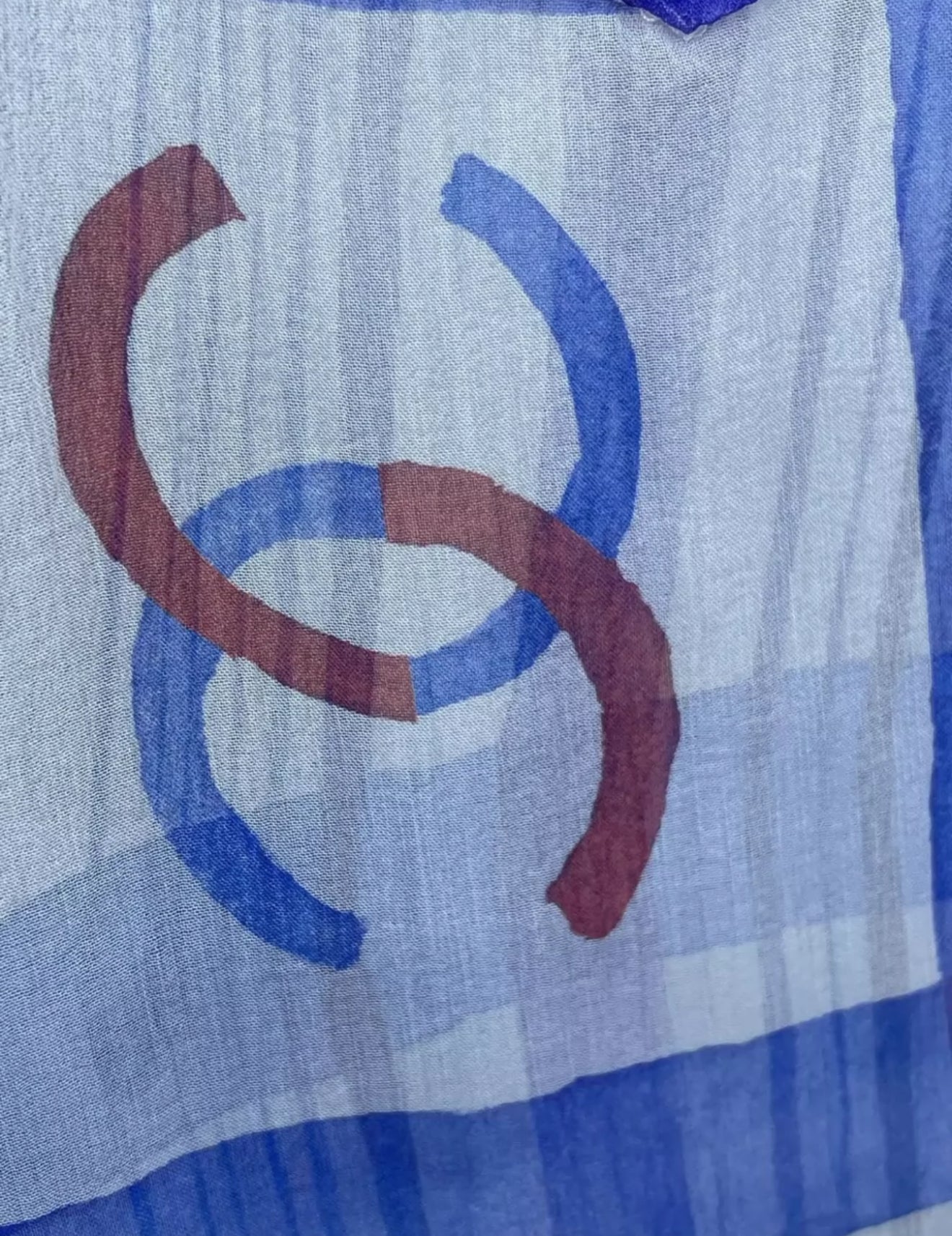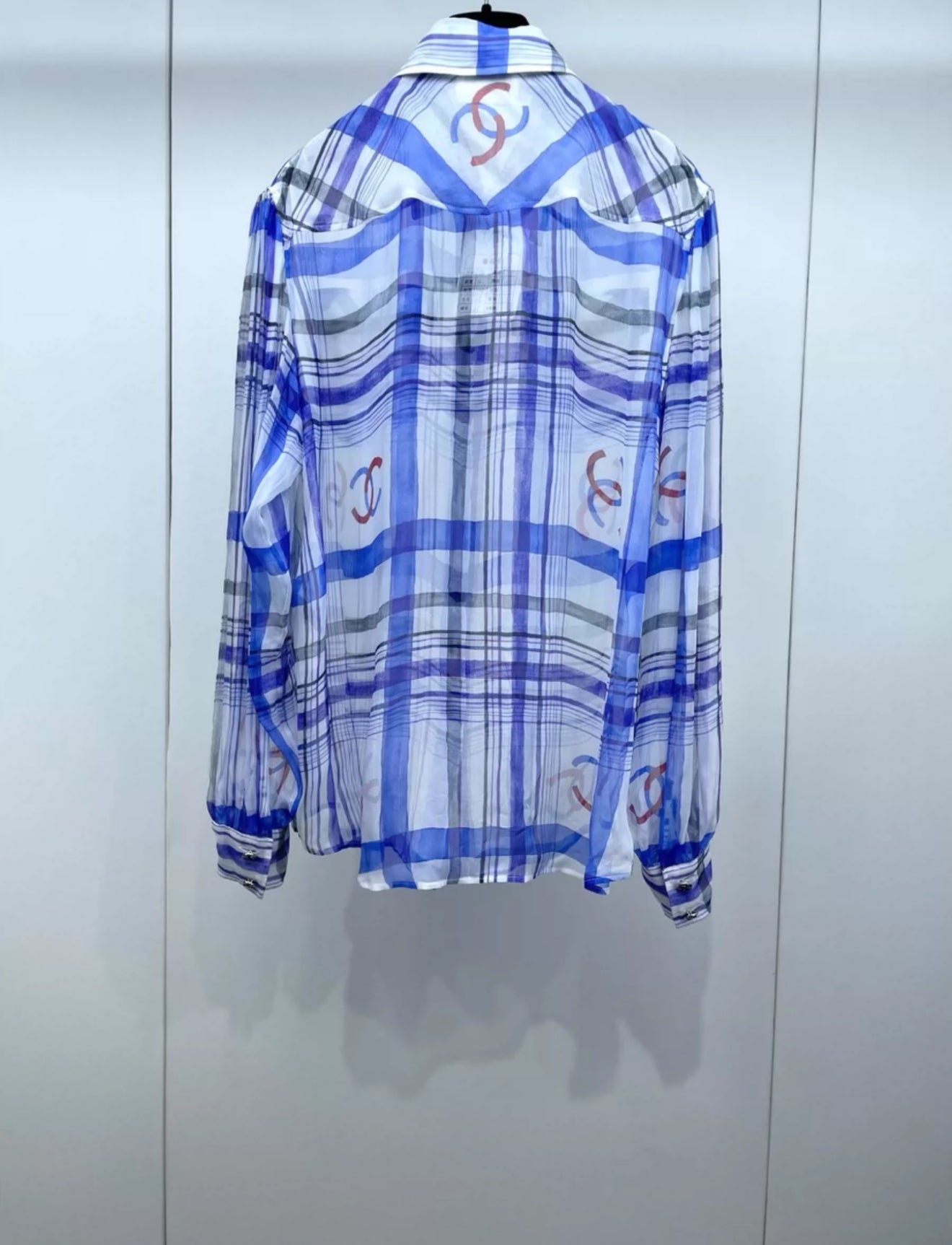 This elegant Chanel silk shirt is crafted in a stylish blue and white design. The shirt is in very good condition and comes in a size 38. Perfect for adding a touch of luxury to your wardrobe, this high-quality shirt is perfect for any occasion.