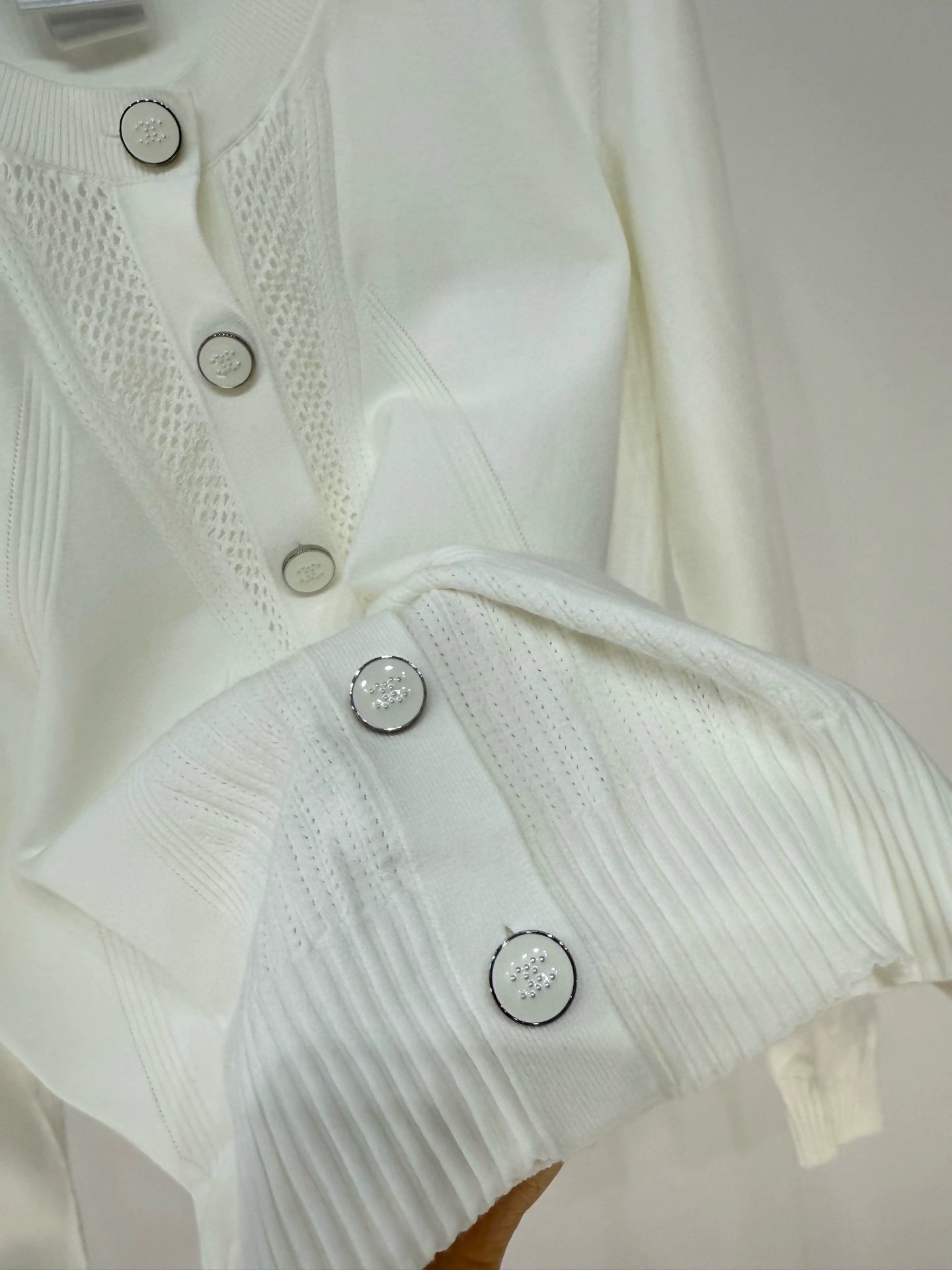 Expertly crafted from luxurious ecru knit fabric, this Chanel 24B cardigan is a timeless addition to any wardrobe. Designed in a size 38, it offers a perfect fit and exudes elegance. Perfect for any occasion, this brand new cardigan is a must-have for fashion lovers.