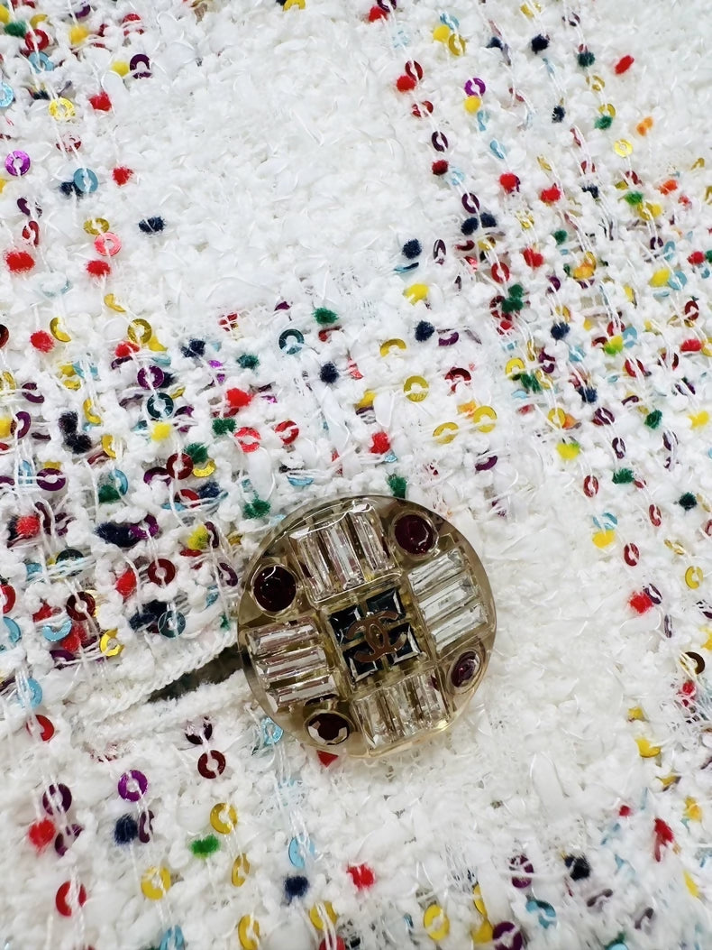 This spectacular Chanel 24S iridescent white ensemble in size F36 arrives unworn, featuring a coordinated jacket and skirt adorned with lustrous glass buttons and exquisite sequin embellishment. The shimmering sequins catch light beautifully, creating an enchanting effect perfect for evening celebrations and special occasions. The refined construction and thoughtful pairing deliver instant sophistication without styling effort. Wear together for maximum impact or separate for versatile layering. A show-stopping investment that celebrates Chanel's mastery of embellishment and artisanal craftsmanship—essential for those who desire memorable elegance.