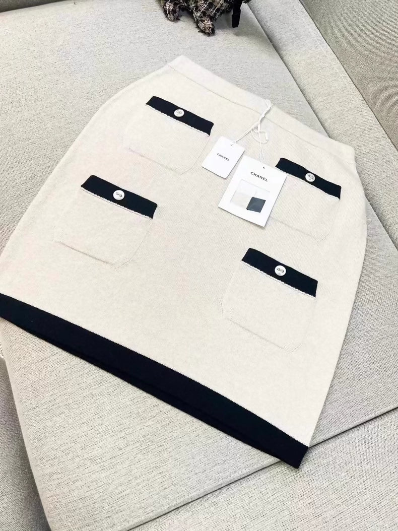 The Chanel 25k beige and black skirt features a four-pocket design in a knit midi length, size 40, with a waist measurement of 76 cm and a length of 54 cm. This brand new skirt combines functionality with classic style, offering ample storage and a sophisticated aesthetic suitable for various occasions.