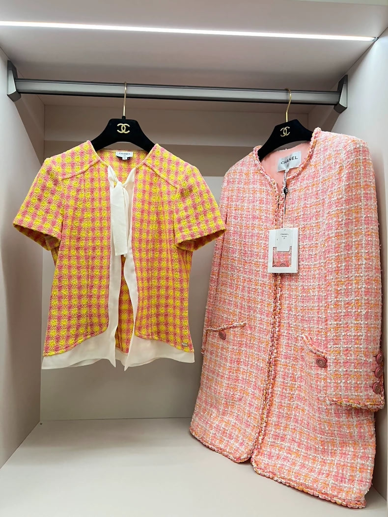 Chanel 25s orange plaid short-sleeved T-shirt in size 36, presented in near-new condition. This iconic piece captures the house's signature aesthetic with its vibrant orange hue and refined plaid pattern, offering timeless versatility for elevated everyday wear. A collector's essential from the coveted 25s collection.