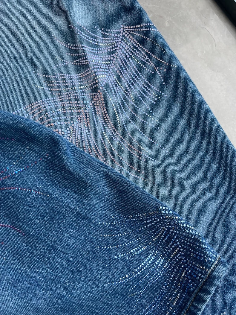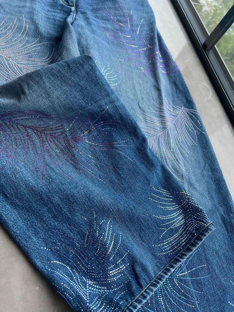 These spectacular Chanel 25S wide-leg pants command attention with their lavish embellishment of full rhinestones and feathers. Originally size 38, they have been expertly tailored to a waist of 67–68cm and length of 95cm for a refined fit. The dramatic embellishments create an unforgettable silhouette perfect for evening wear and special occasions. Pair with a simple top to let the pants shine, or layer under a structured jacket for bold sophistication. A show-stopping investment piece that celebrates Chanel's fearless artistry and uncompromising craftsmanship.