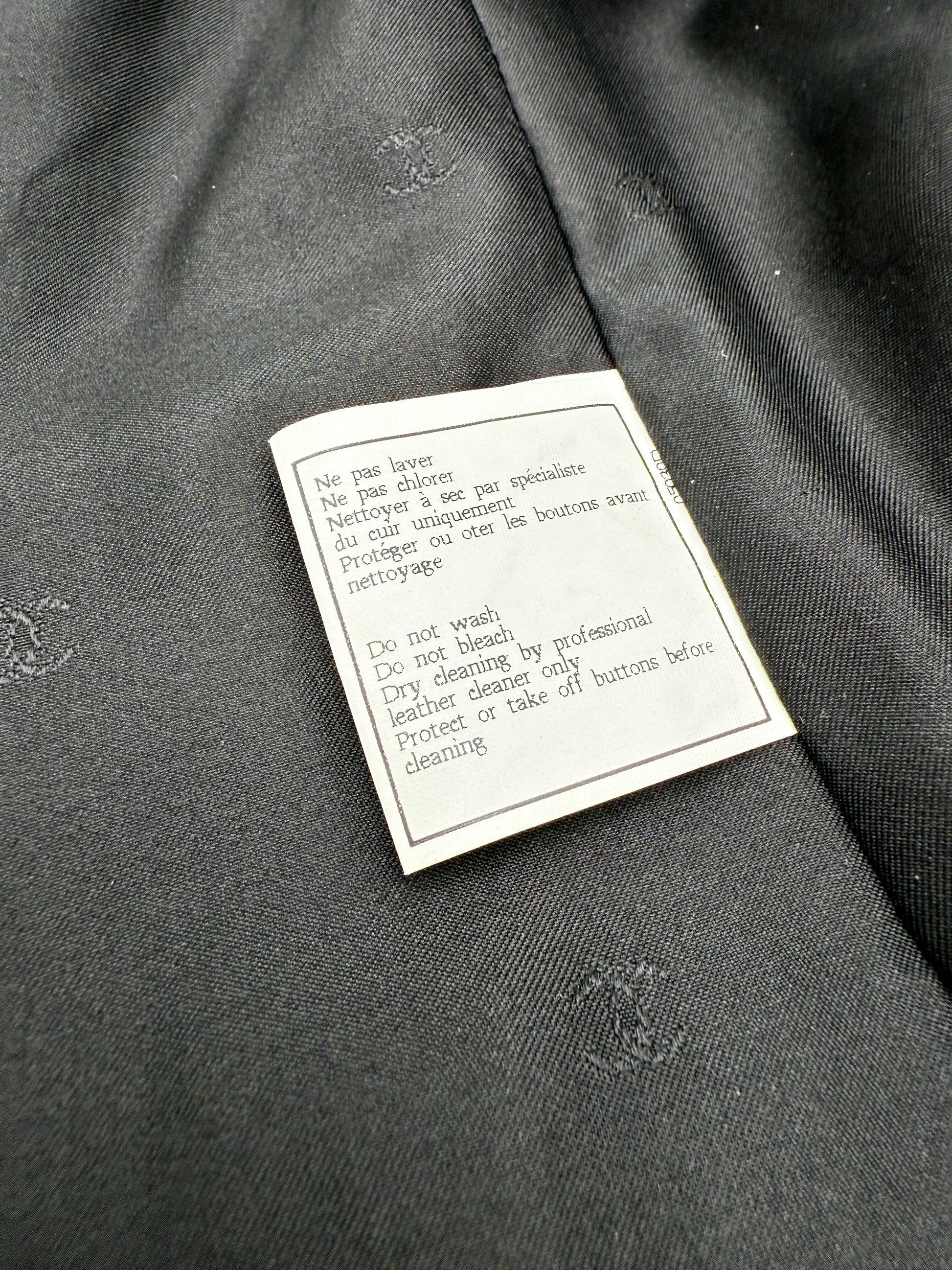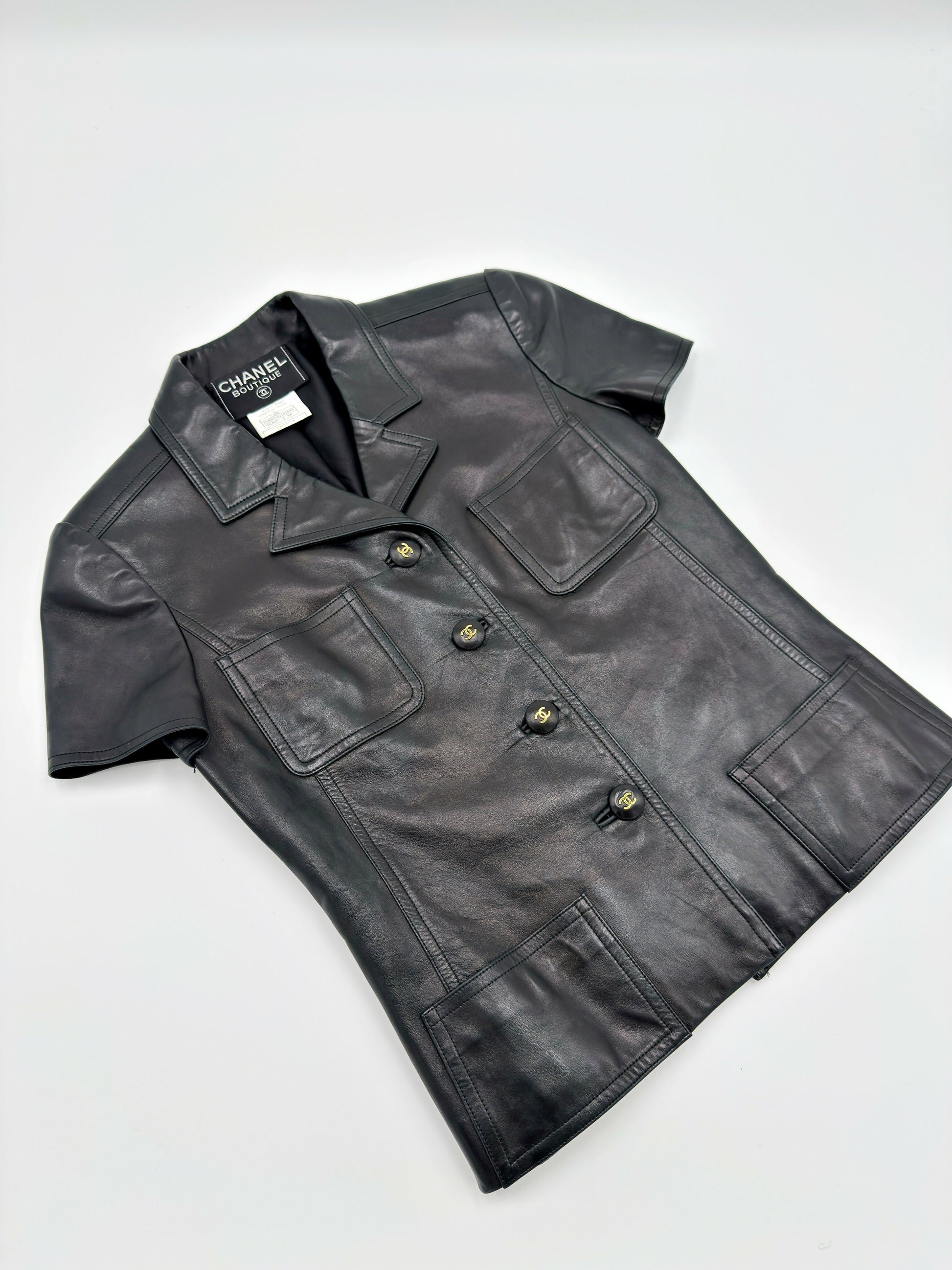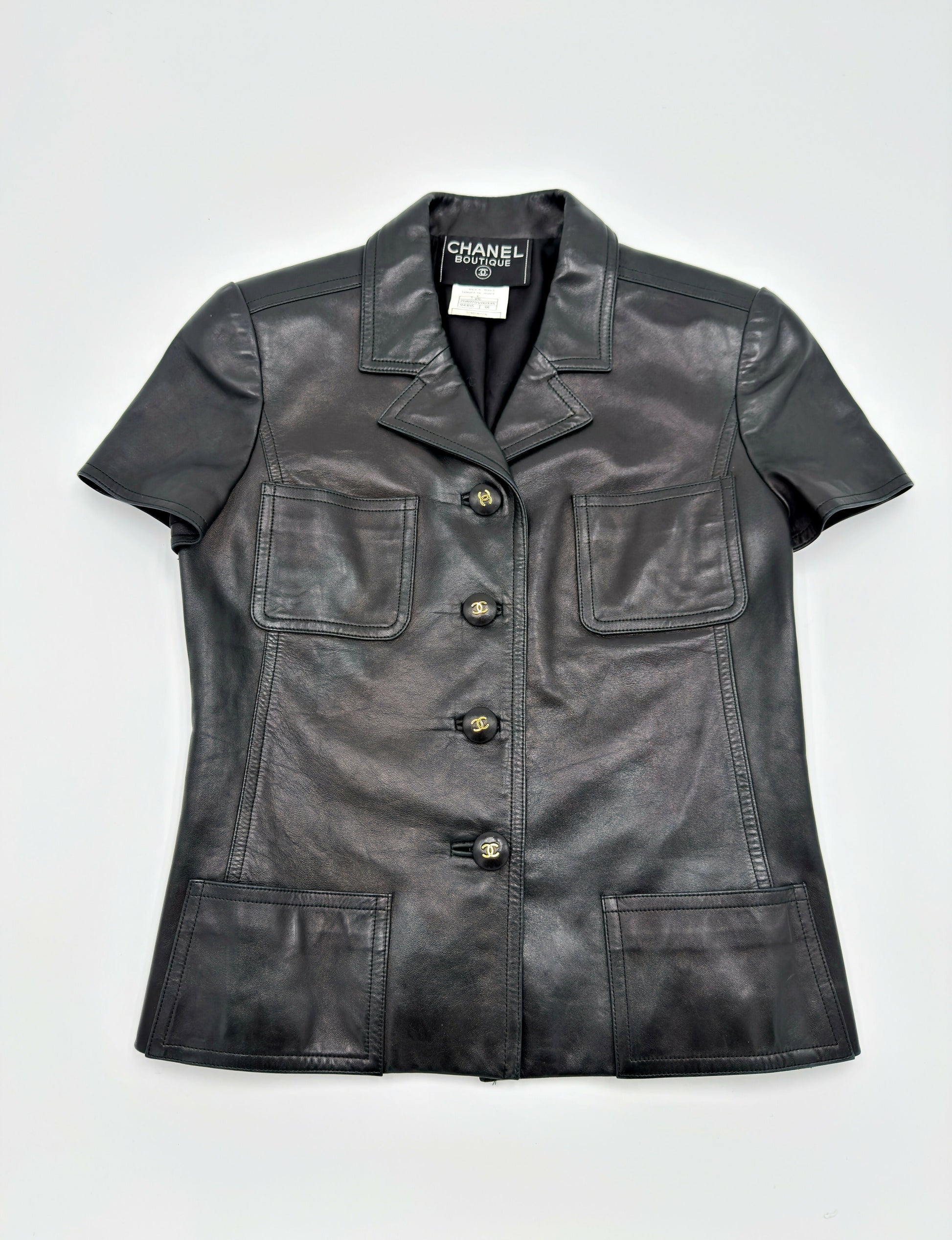 From Chanel’s 1997 Cruise collection, this short-sleeve black leather jacket is a timeless piece of house design. Featuring classic notched lapels, four front patch pockets, and iconic CC logo buttons in gold-tone, it embodies understated elegance with an edge.