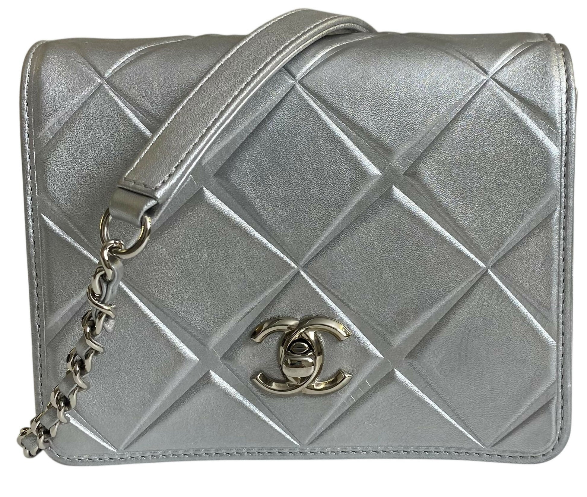 This cute mini shoulder bag is crafted of luxuriously textured diamond-quilted calfskin leather in metallic silver. The bag features leather-threaded silver chain shoulder straps and a facing flap with a silver Chanel CC turn lock. The flap opens to a burgundy leather interior with zipper and patch pockets.