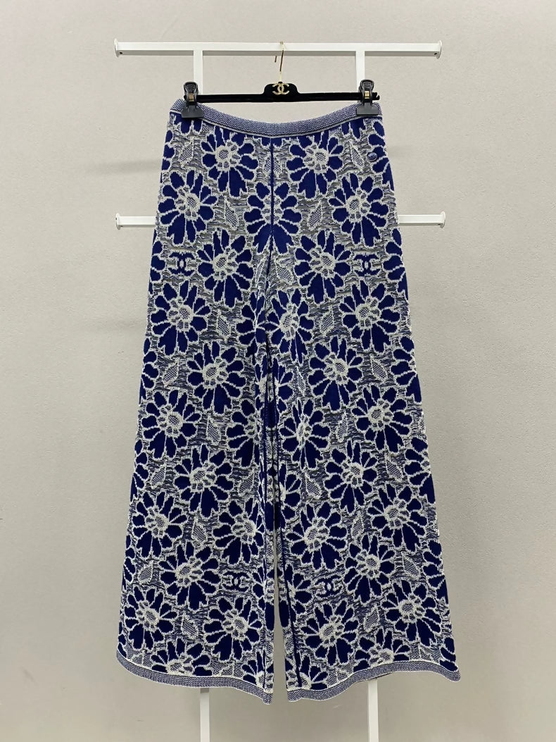 Elevate your everyday look with these Chanel blue and white wide-leg pants featuring delicate hollow camellias. The perfect combination of style and comfort, these pants are a must-have addition to your wardrobe. Available in size 40, these brand new and unused pants are ready to elevate any outfit.