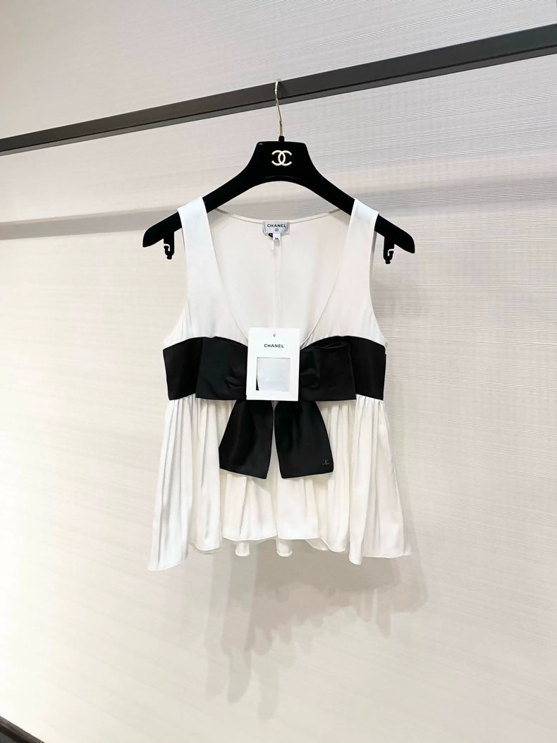 The Chanel 25K black and white silk top, available in size 34, combines luxury and elegance. Crafted from high-quality silk, it offers a soft touch and breathable comfort. The bow detail adds sophistication, making it suitable for both formal and casual settings.