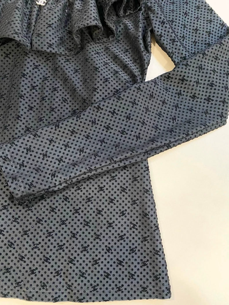 The Chanel 24B black top features a size F36 design crafted from velvet, showcasing a subtle logo pattern. Its ruffled detail enhances visual interest while the stretchy material ensures comfort across various seasons. This versatile piece offers both style and adaptability, meeting diverse wardrobe needs.