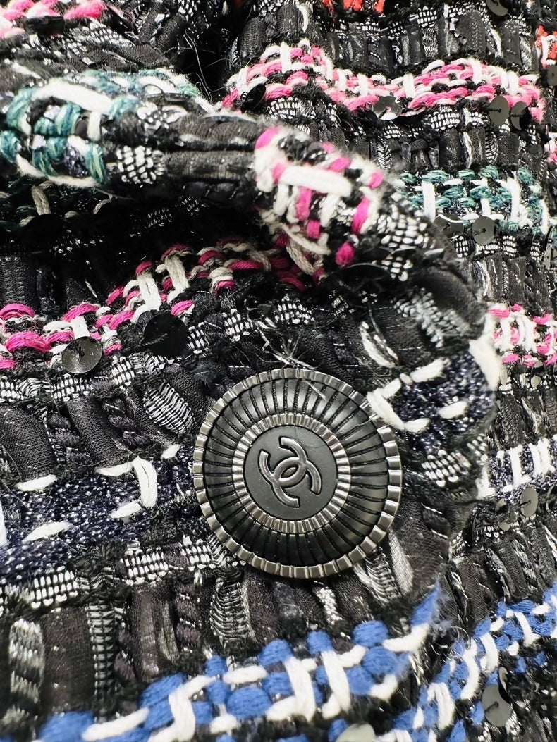 Introducing the Chanel 20C tweed jacket, crafted in luxurious and unique irregular sequined fabric. A statement piece in size F34, this jacket combines elegance and modernity to elevate any look. Experience the sophistication and exclusivity of Chanel with this must-have addition to your wardrobe.