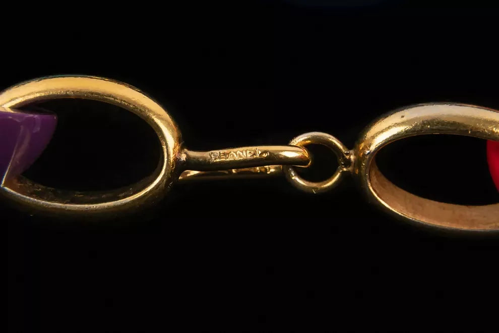 Expertly crafted in France, it features a succession of colorful bakelite medallions in glossy hues of red, yellow, green, blue, orange, and violet, each linked by gold-tone metal connectors adorned with the iconic interlocking CC logo. The contrast between the smooth, candy-like finish of the bakelite and the luminous gold detailing gives this piece its irresistible allure and sculptural presence.