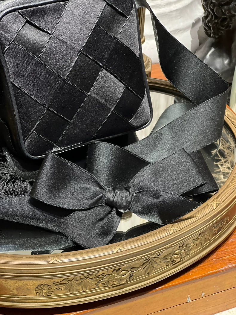 This rare vintage Chanel satin black woven crossbody bag is a must-have for any fashionista. With its timeless design and luxurious material, it is the perfect statement piece for any outfit. Only a limited number of these bags were produced, making it a unique and highly sought after item. Don't miss the chance to add this iconic bag to your collection.