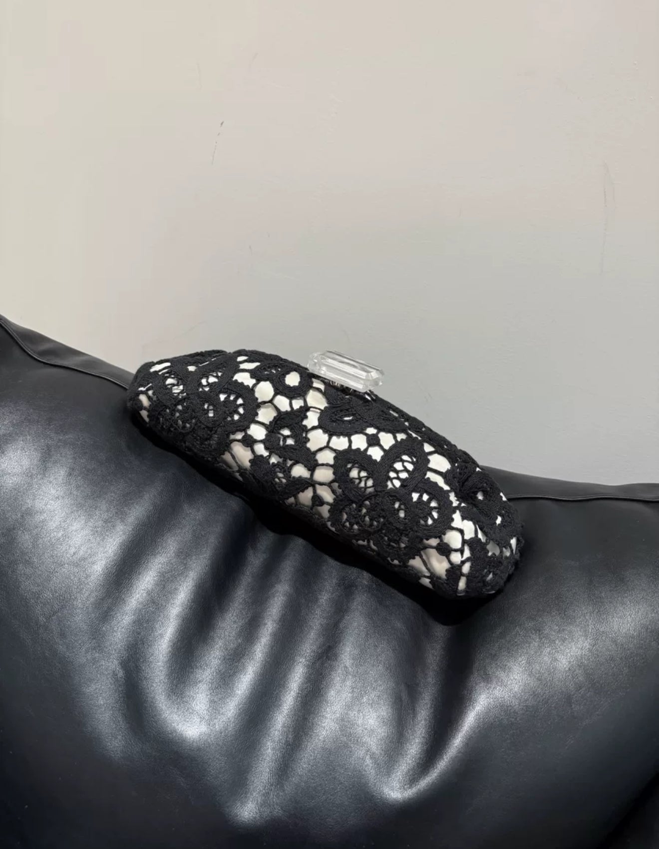 This Chanel rare perfume bottle buckle lace evening bag is a vintage piece in good condition. A must-have for any fashion lover or collector, this bag boasts a unique perfume bottle buckle and delicate lace details that add a touch of elegance to any outfit. Own a piece of Chanel history with this one-of-a-kind evening bag.