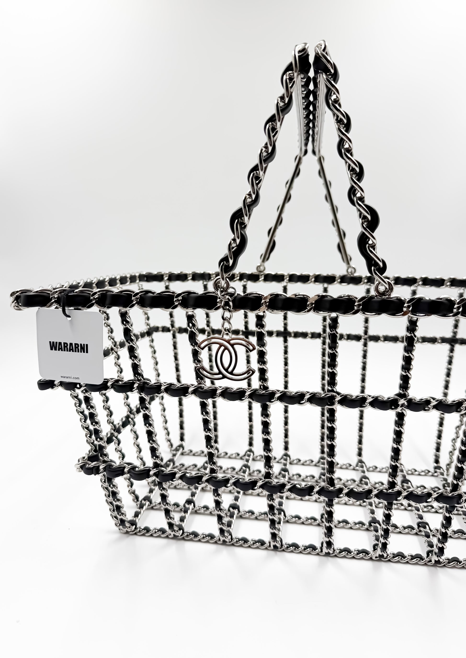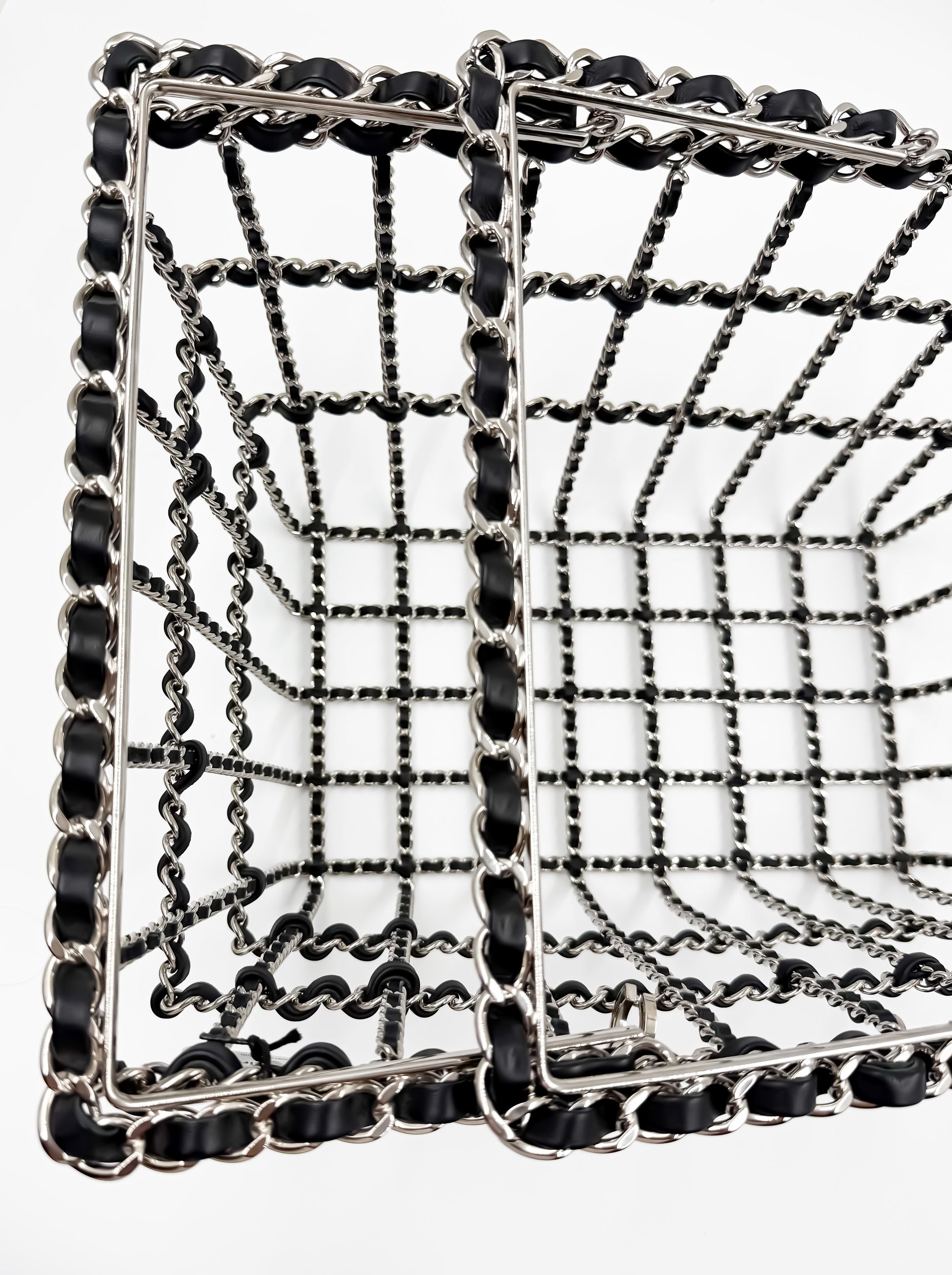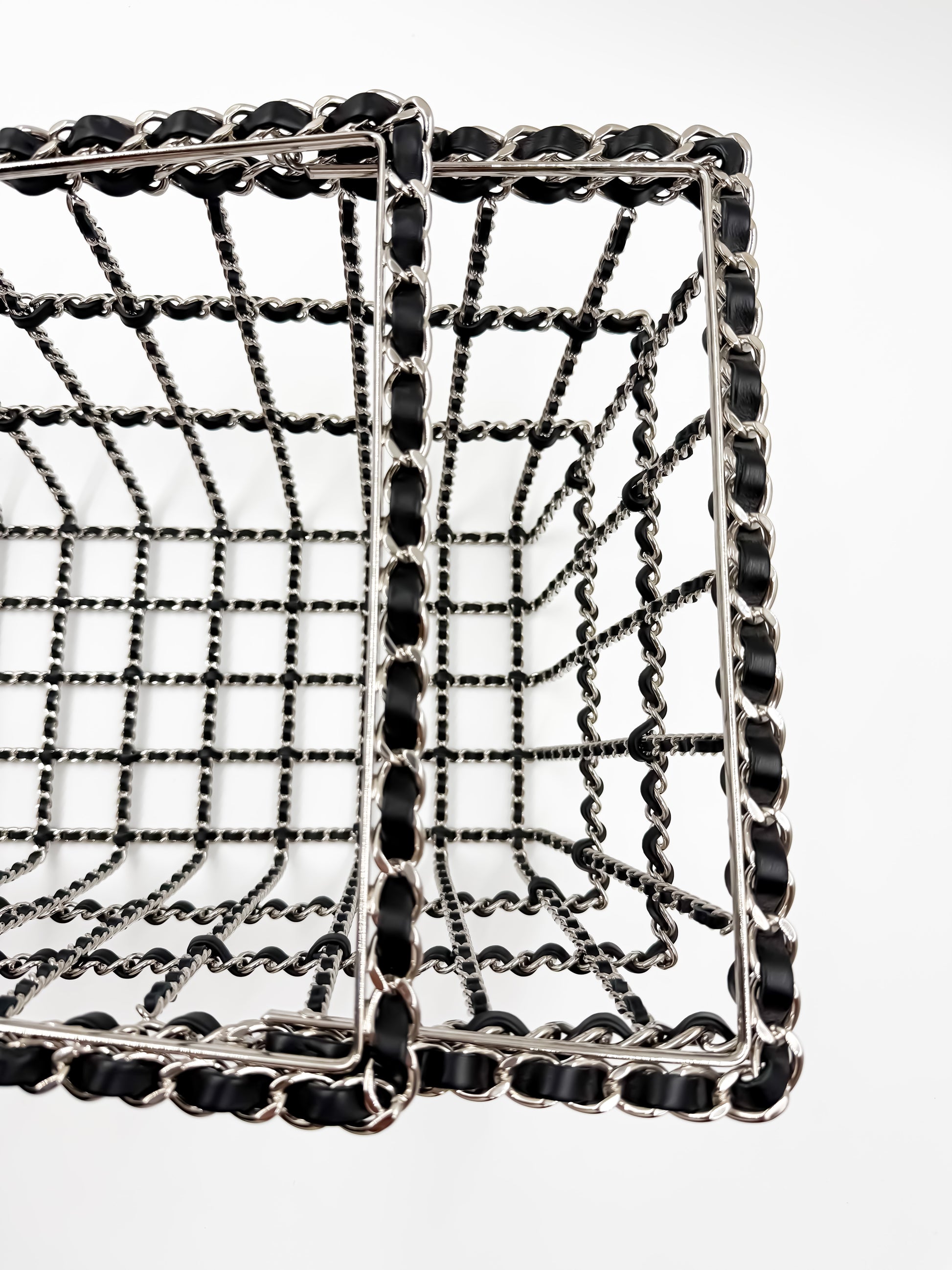 Produced in exceedingly limited numbers, each basket was meticulously constructed from silver-toned metal and interlaced with fine leather, crowned by the iconic interlocking CC charm and supple leather-woven chains. This was Chanel’s tongue-in-cheek homage to modern consumption—an everyday object elevated to an artefact of luxury.