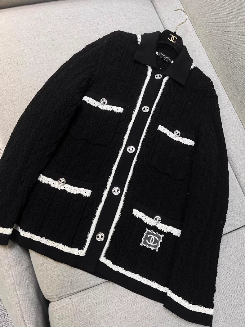 The Chanel 24C black double-C cardigan is a size 38 knit garment featuring an openwork design and four practical pockets. With a bust measurement of 108 cm and a length of 82 cm, this cardigan combines elegance and functionality, making it suitable for various occasions while maintaining a contemporary aesthetic.