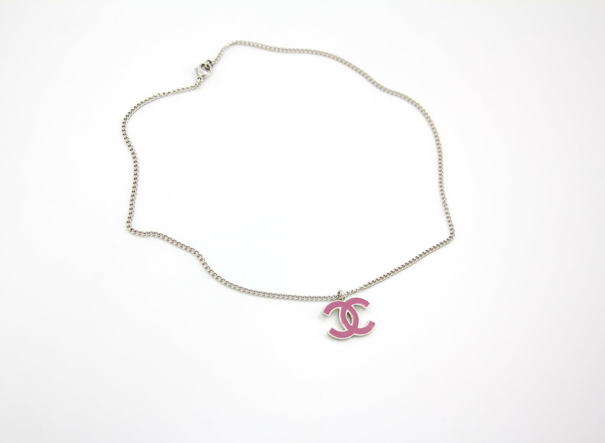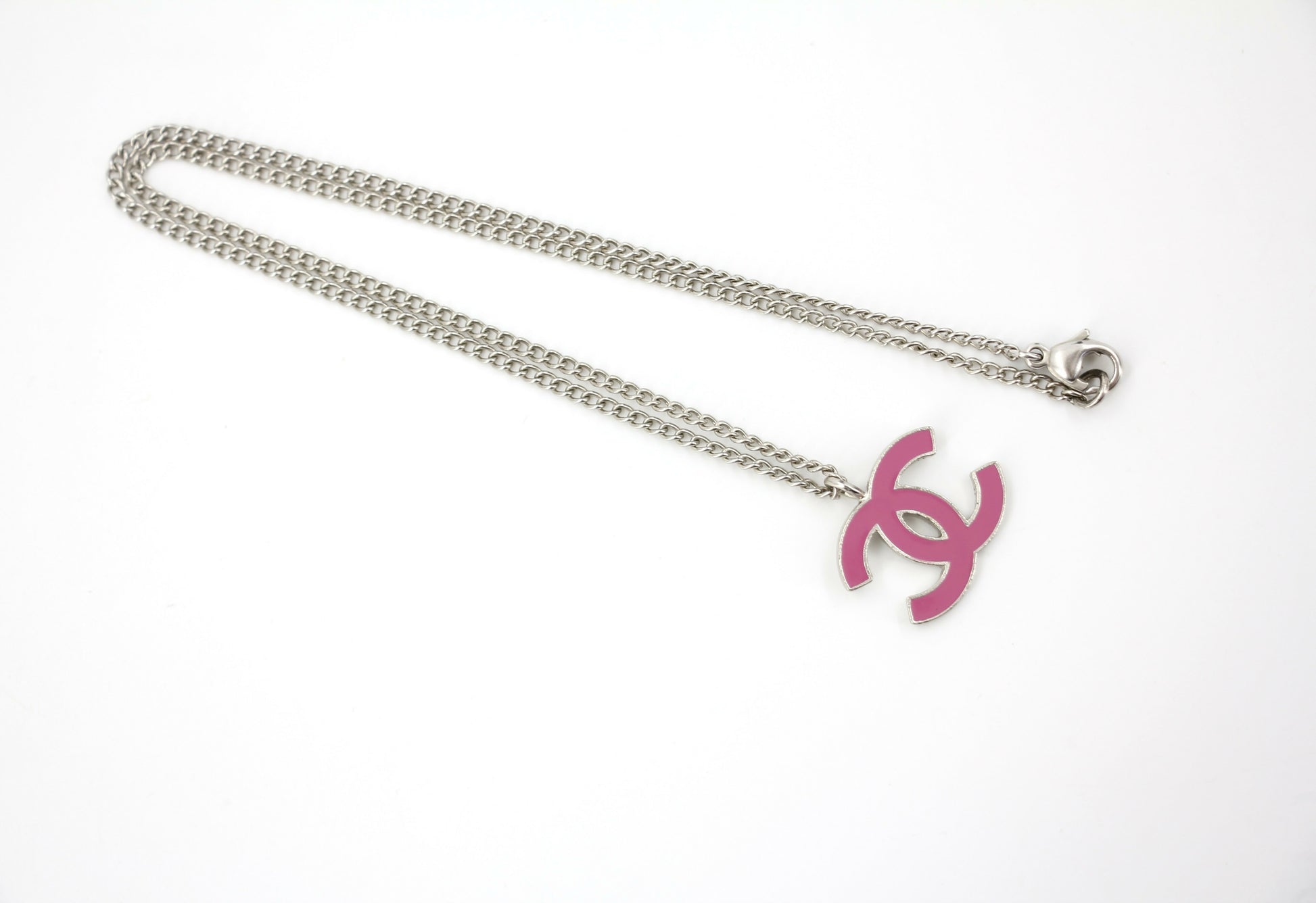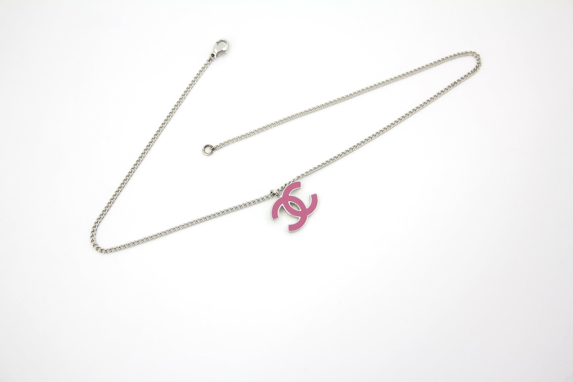 This vintage Chanel necklace from the 04P collection features a beautiful enamel peach pink CC pendant on a silver chain. The perfect accessory to add a touch of elegance to any outfit.
