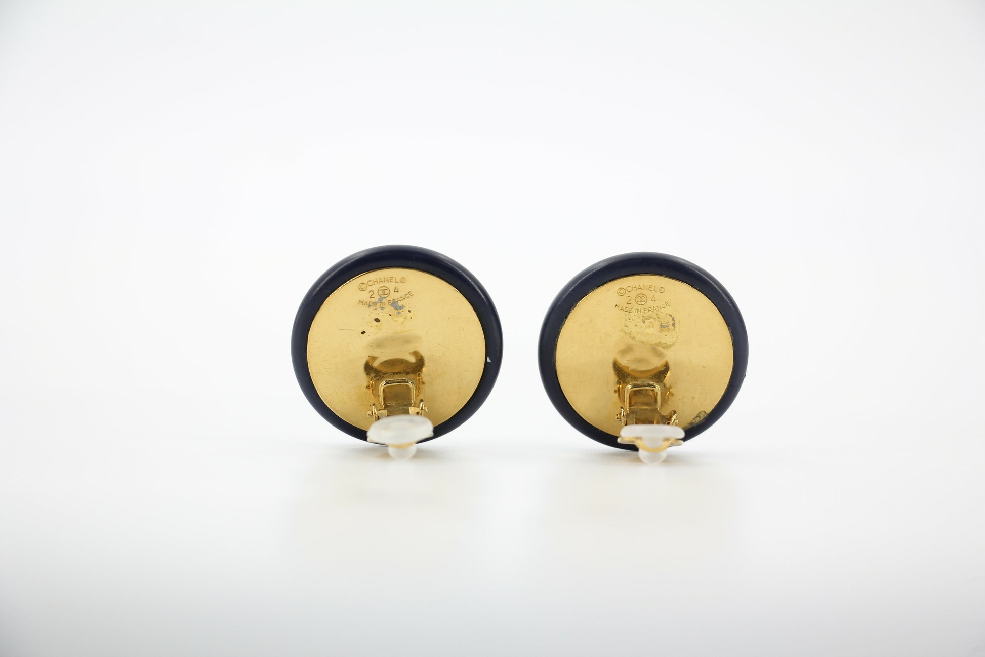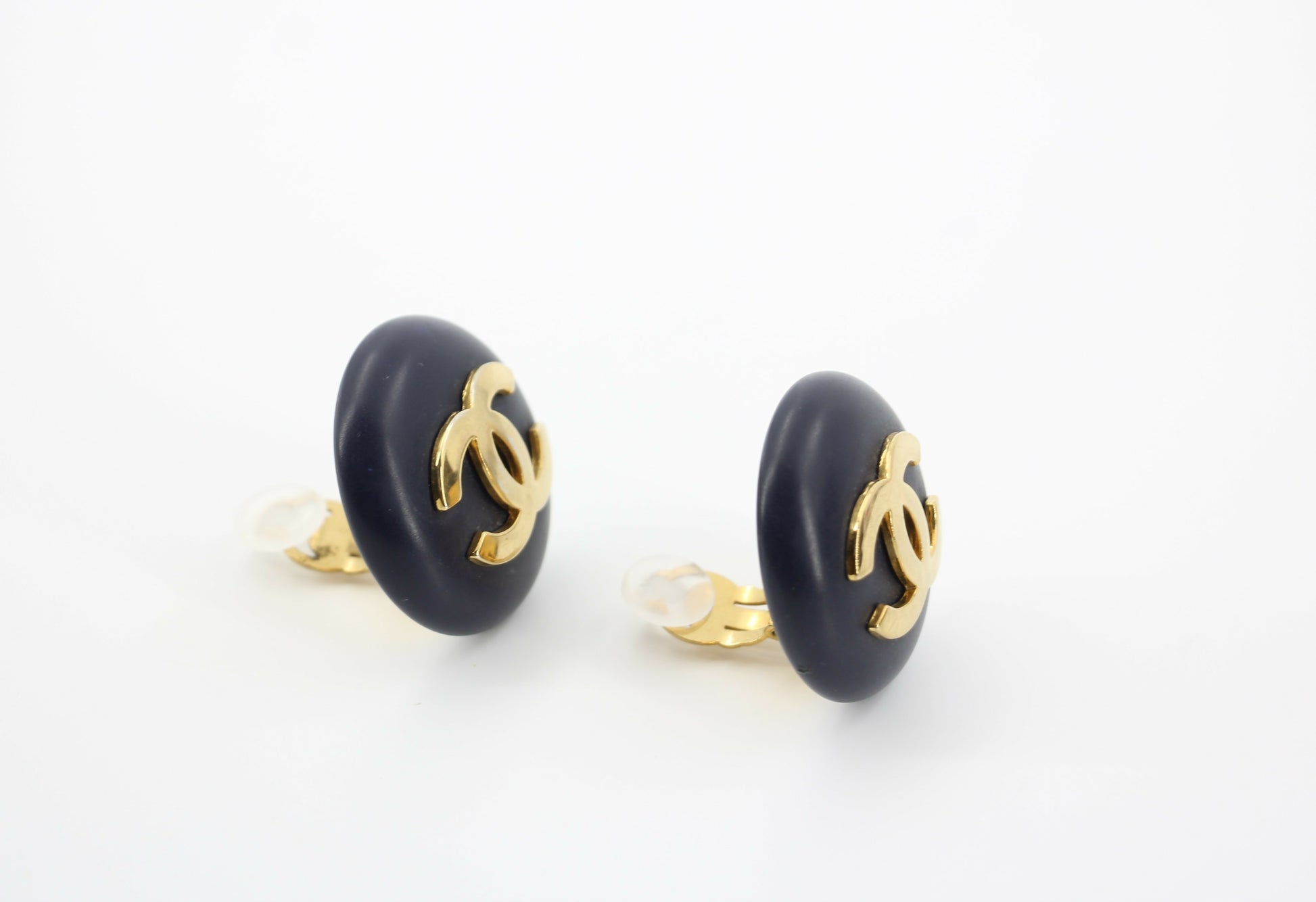 These classic Chanel earrings feature a vintage design with a large round clip-on style and a smooth navy blue resin finish. Add a touch of elegance to any outfit with this timeless accessory. Expertly crafted with the iconic CC logo, these earrings exude luxury and sophistication.