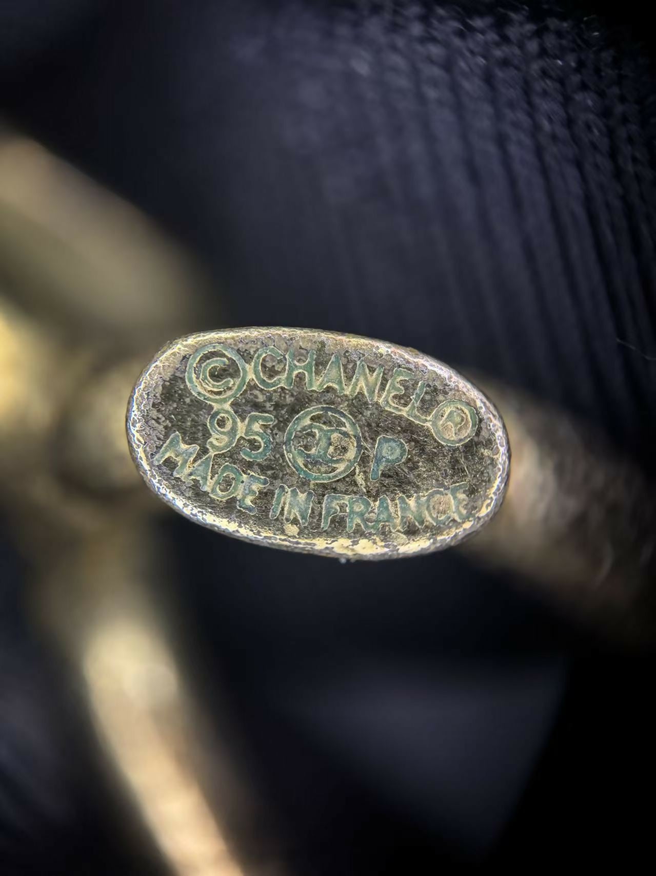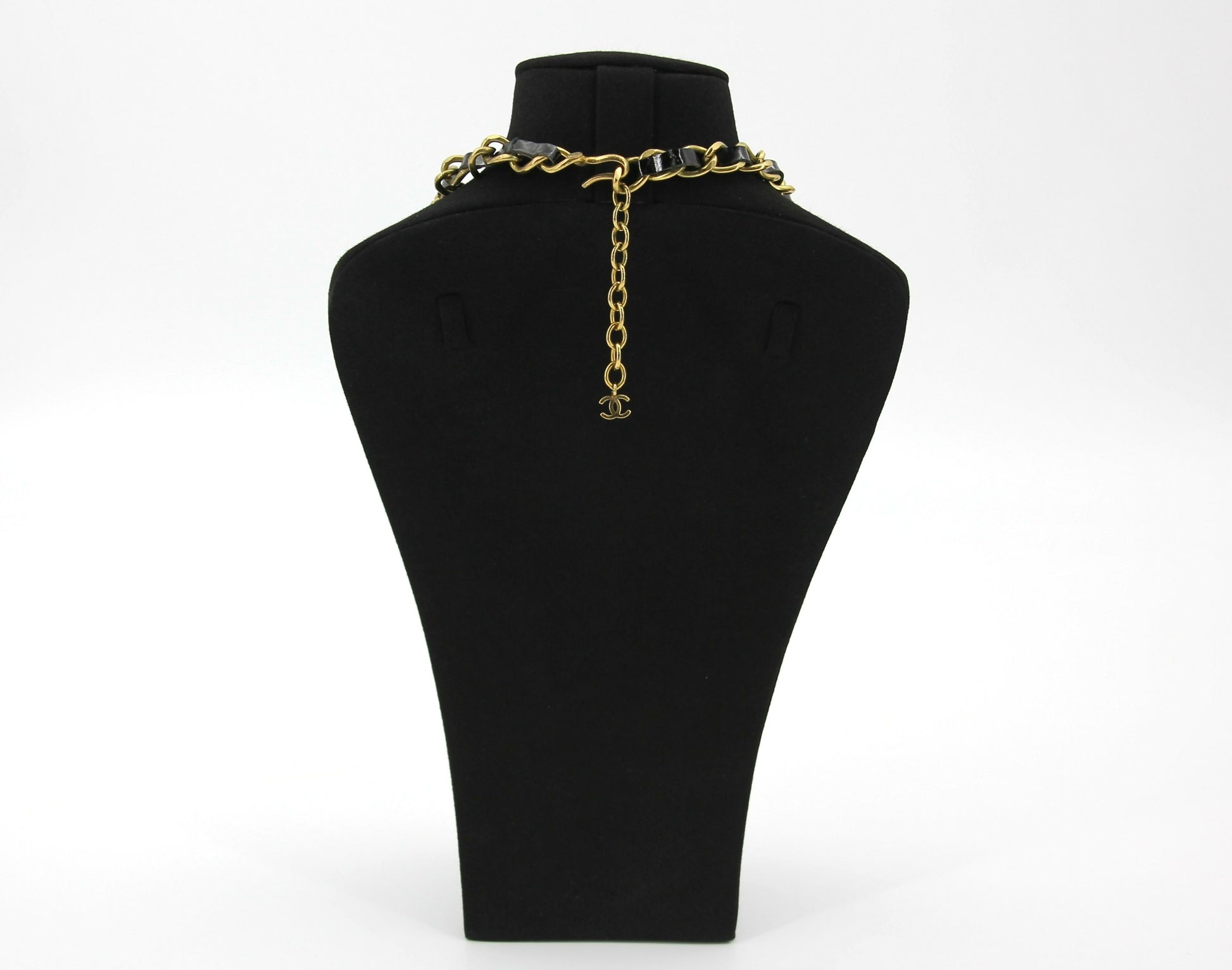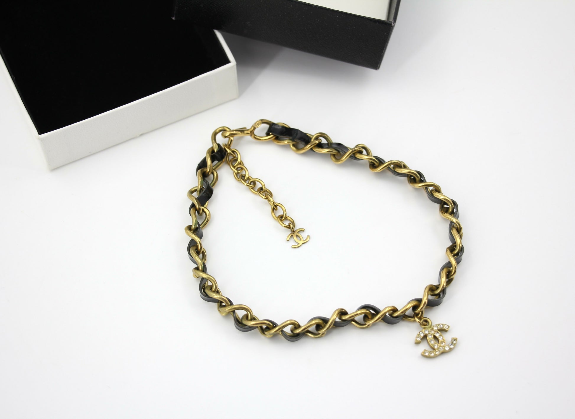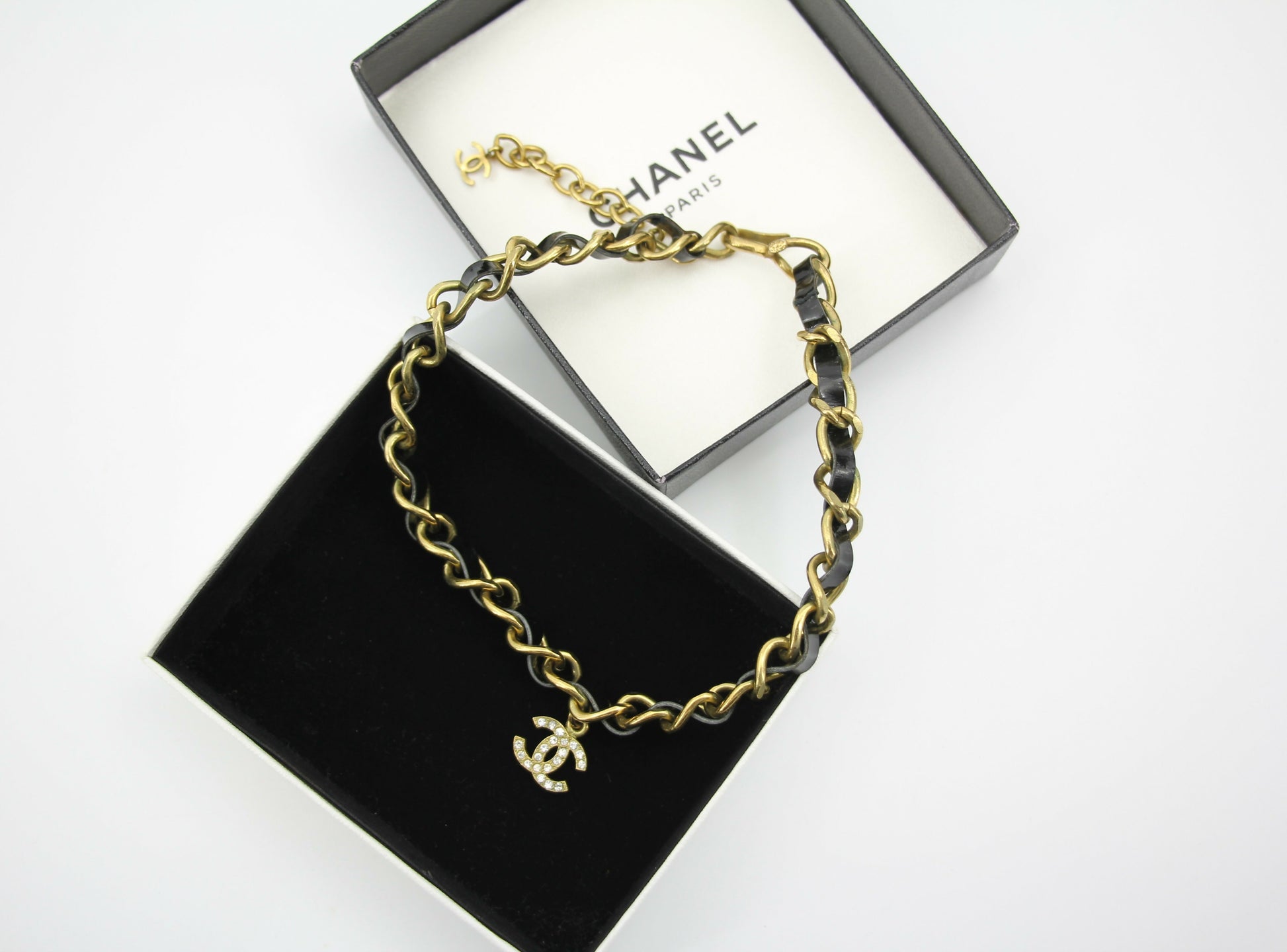 Chanel Vintage 95P Rhinestone Gold-plated Black Leather Chain CC Choker