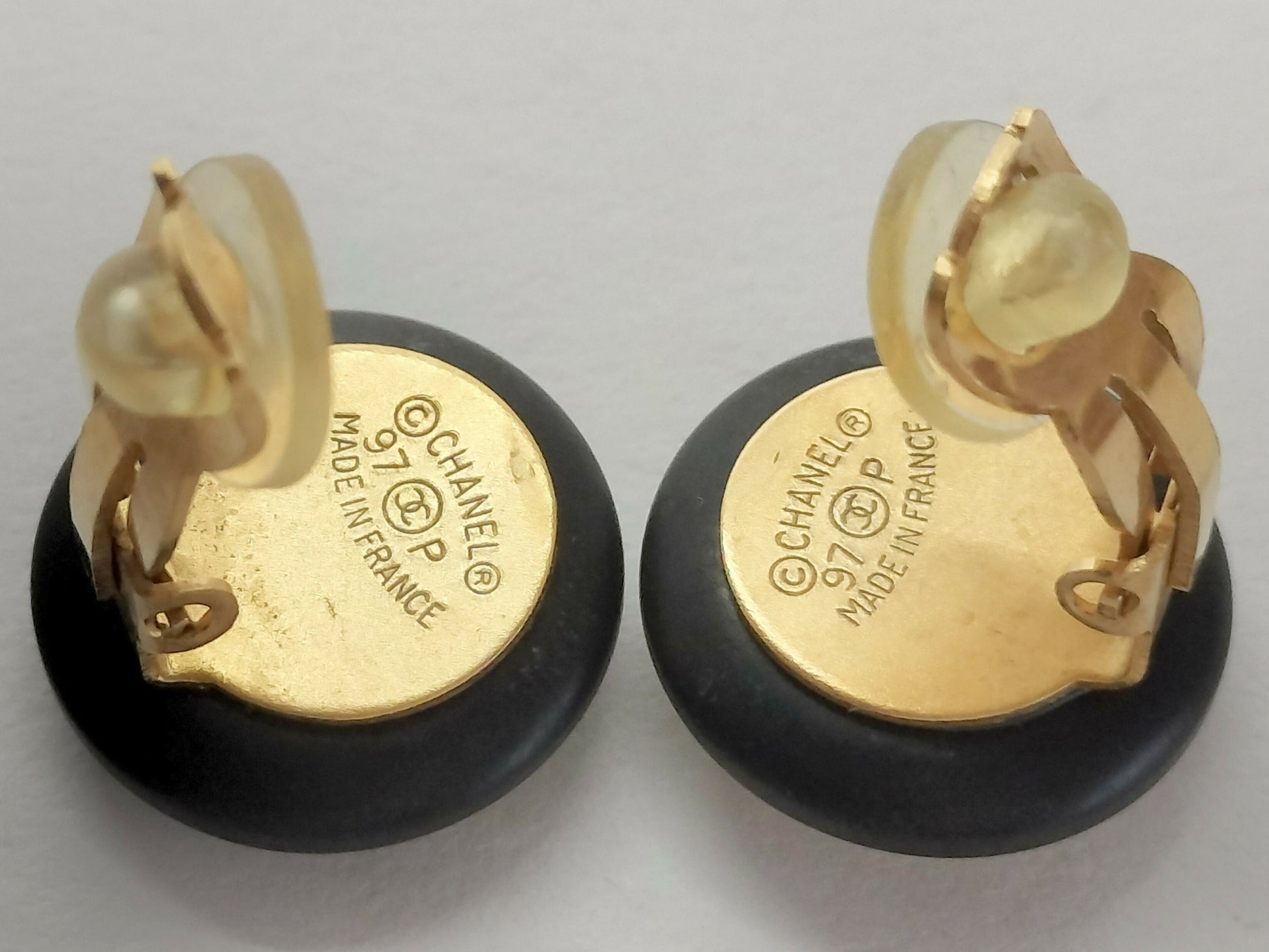 Chanel Vintage 97P Enamel Black & White Round Bean Clip-on Earrings in good condition. These iconic clip-on earrings feature the house's signature enamel design with contrasting black and white round bean motifs. A timeless piece from the 97P collection, perfect for collectors and those seeking authentic vintage Chanel jewelry. Excellent for layering or making a statement with minimal effort. Pre-owned with visible signs of wear consistent with age and use, adding to their vintage charm and authenticity.