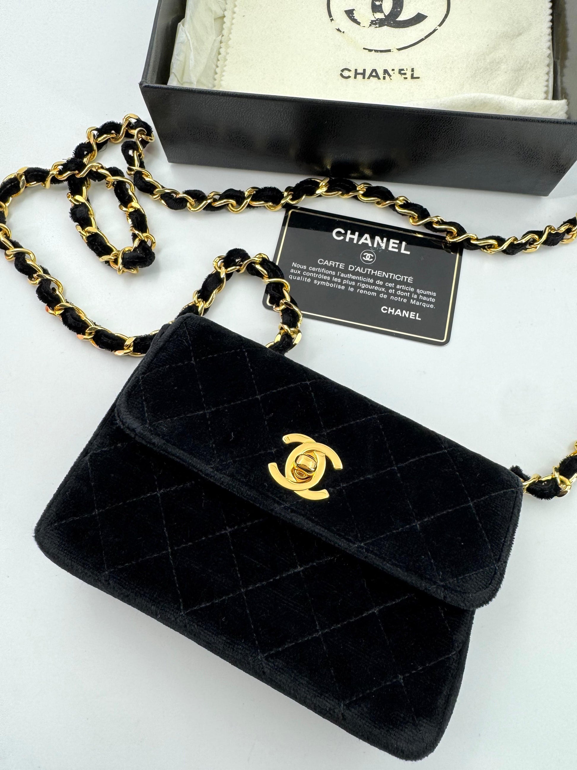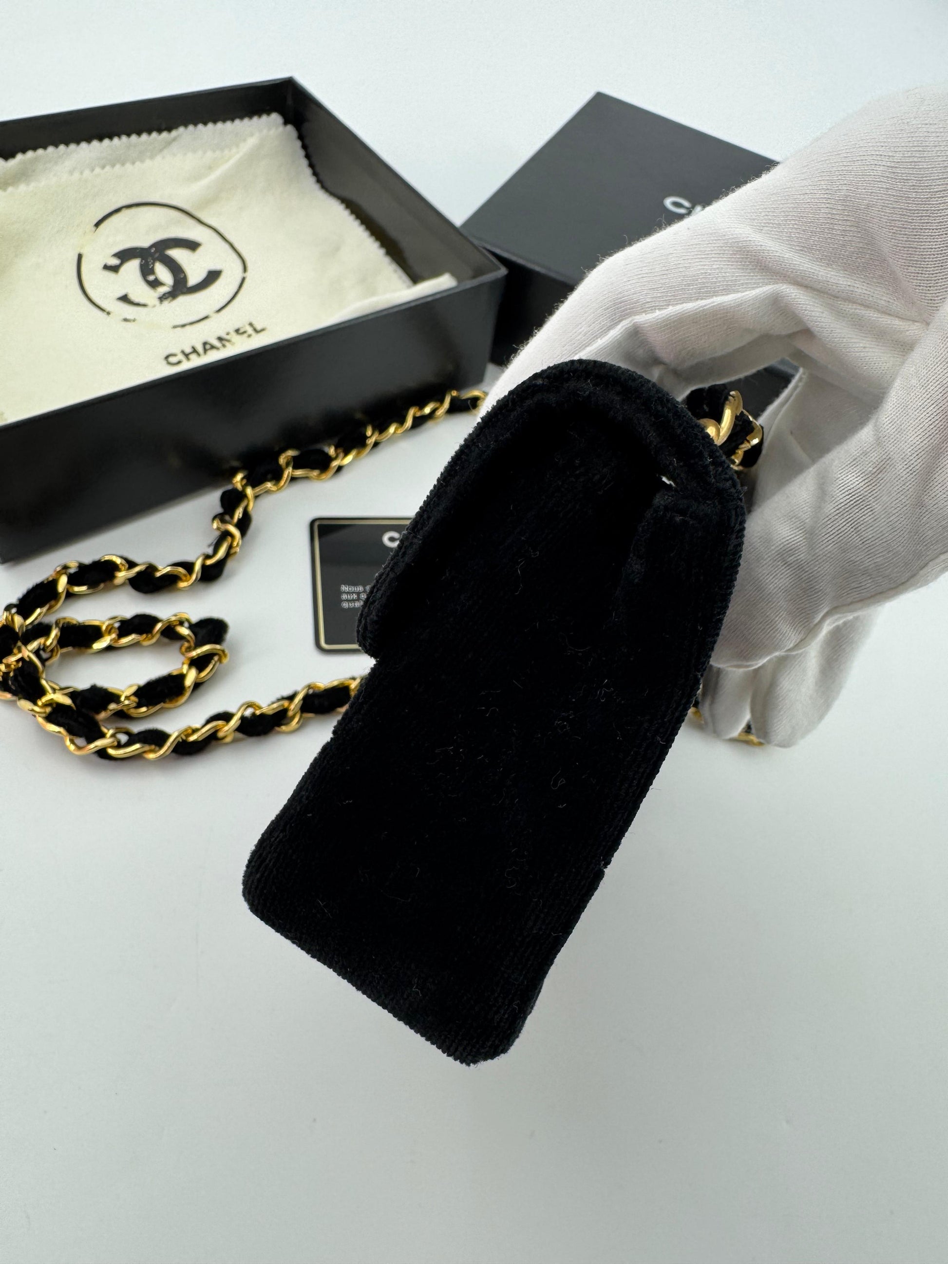 Chanel vintage Black velvet mini square flap bag with gold hardware