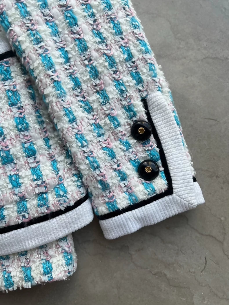# Chanel Vintage Blue & Pink Woven Jacket and Skirt Set A captivating vintage Chanel ensemble in dreamy blue and pink tones, this coordinated jacket and skirt set showcases the house's mastery of refined tailoring. The woven construction delivers texture and depth, while the soft color palette exudes timeless elegance. The skirt has been thoughtfully altered for a contemporary silhouette. Marked size 40 but runs small—ideally suited for sizes 34–36. A rare collector's piece that seamlessly transitions from day to evening, embodying Chanel's enduring aesthetic of understated sophistication.