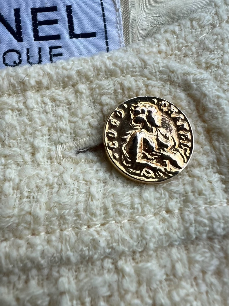 A rare vintage Chanel ensemble in pristine, unworn condition—a luminous light yellow jacket and skirt set that captures the house's timeless elegance. Sized 40 with a fitted skirt waist of 34, this piece runs small and suits sizes 34–38, offering an authentic vintage fit. The set arrives complete with an accompanying flower brooch and protective fabric pouch, preserving its museum-quality condition. An exceptional acquisition for collectors seeking authentic Chanel heritage pieces with documented provenance and impeccable craftsmanship.