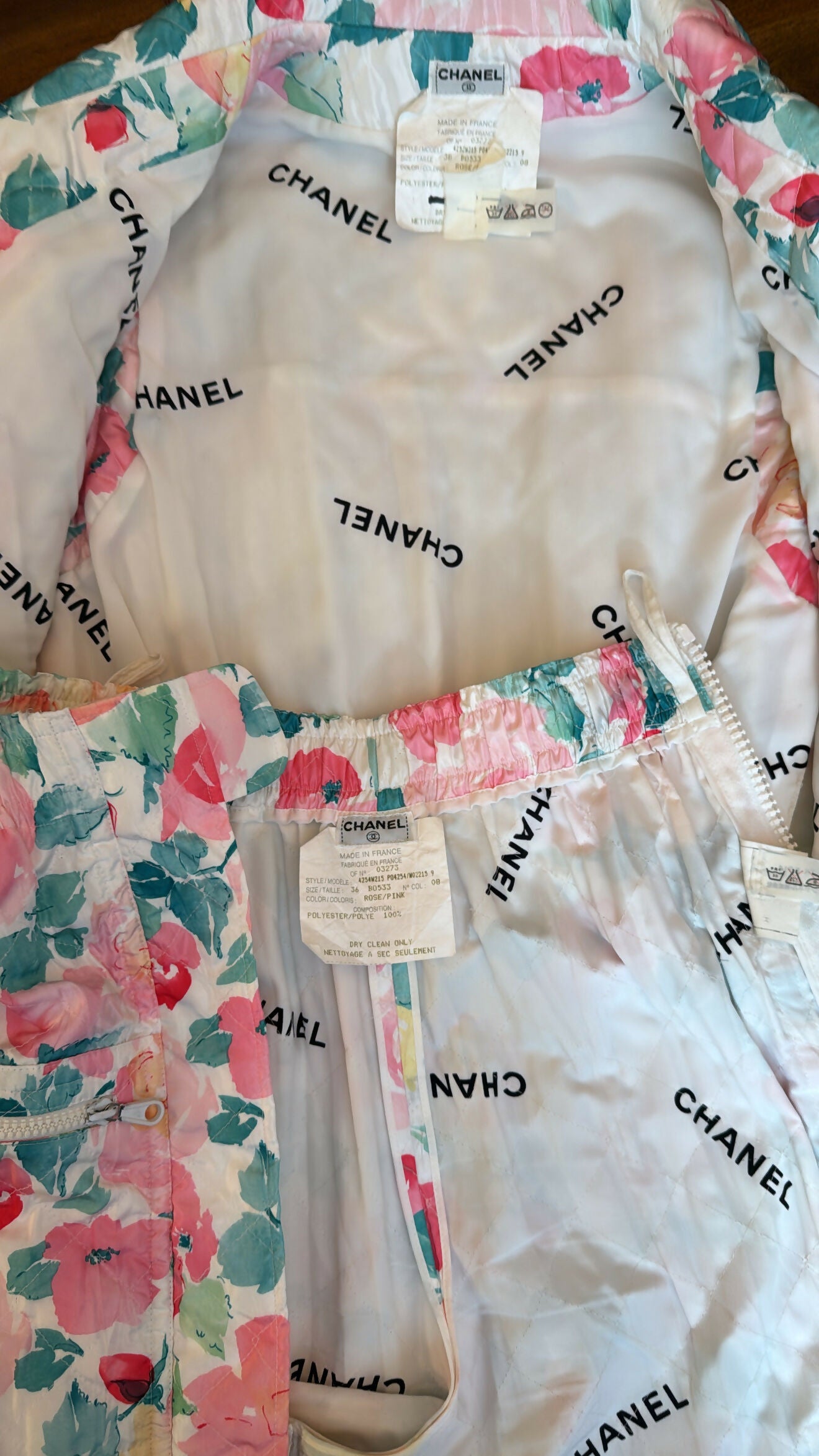 A striking blend of sporty charm and feminine elegance, this vintage Chanel set captures the essence of Karl Lagerfeld’s 1990s aesthetic. Crafted in Chanel’s signature diamond quilting, a detail first introduced in the House’s iconic handbags and later adapted into ready-to-wear—the sleeveless vest and matching shorts deliver both structure and softness. The vibrant floral print adds a playful twist, making this set a standout piece from Chanel’s bold, fashion-forward era.