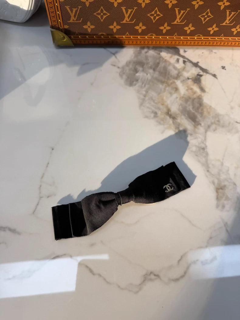 Chanel's classic narrow double-C hair clip with a black bow creates a super cute and charming look.
