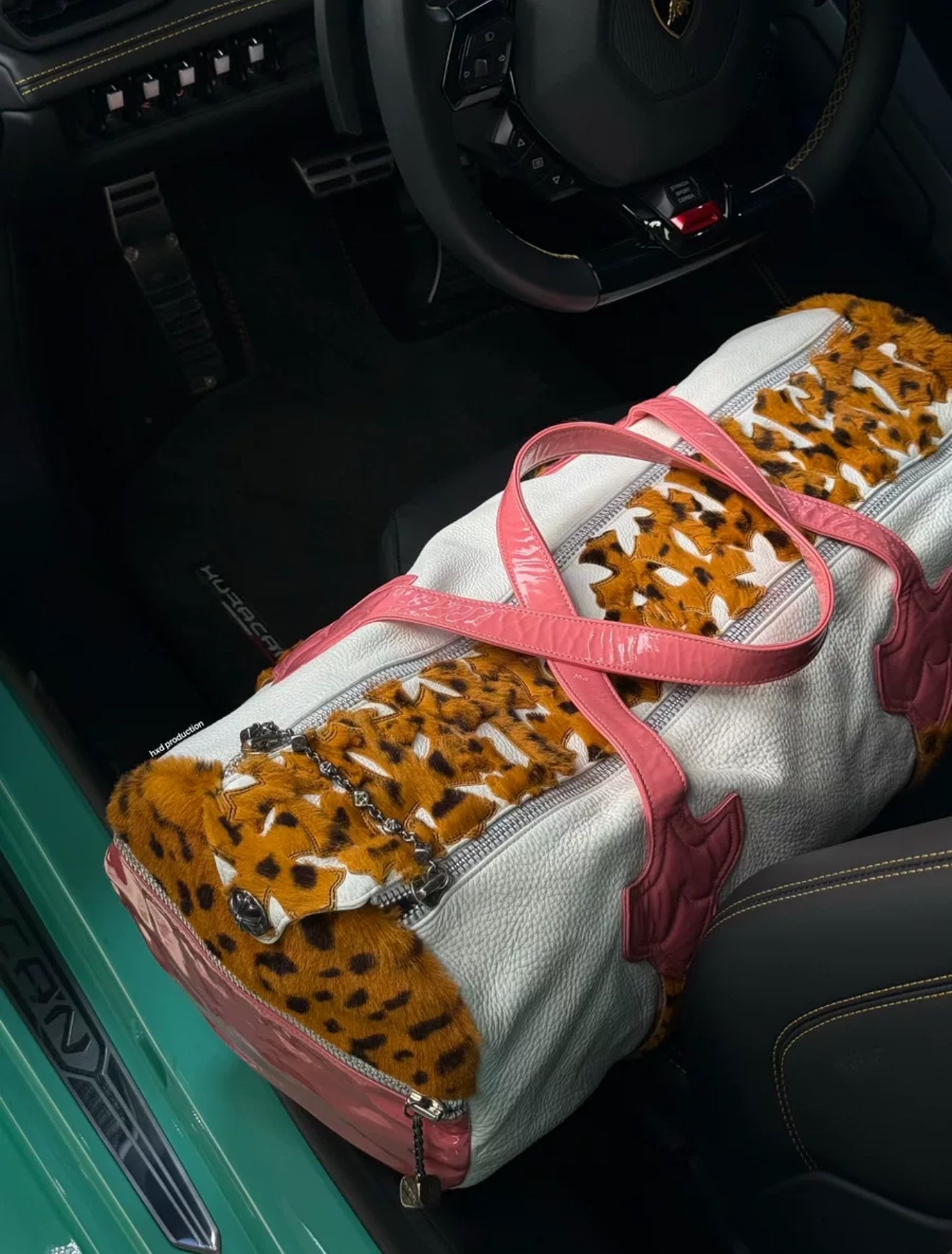 Chrome Hearts duffel bag white leather, pink handles bag with leopard cross patches