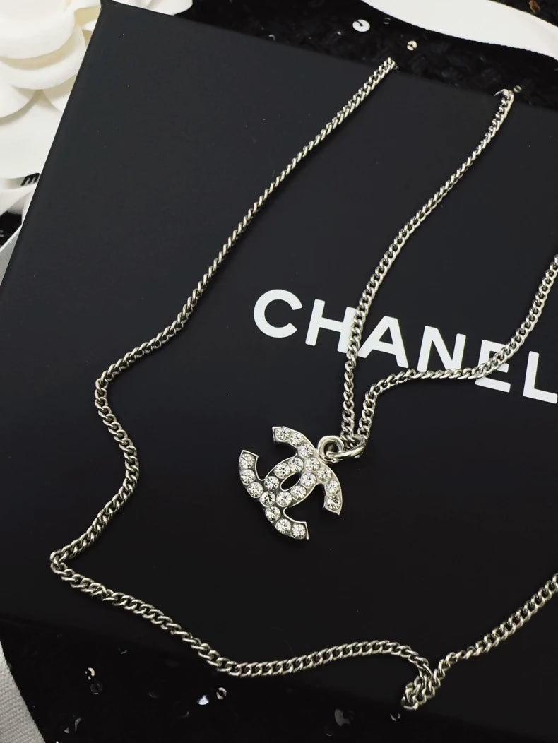 Upgrade your jewelry collection with our Classic Chanel 07V choker necklace. This timeless piece boasts a stunning silver design adorned with double C logos and sparkling diamonds. In near mint condition, this unique necklace is a rare find. Complete your elegant look with this luxurious and rare Chanel necklace.