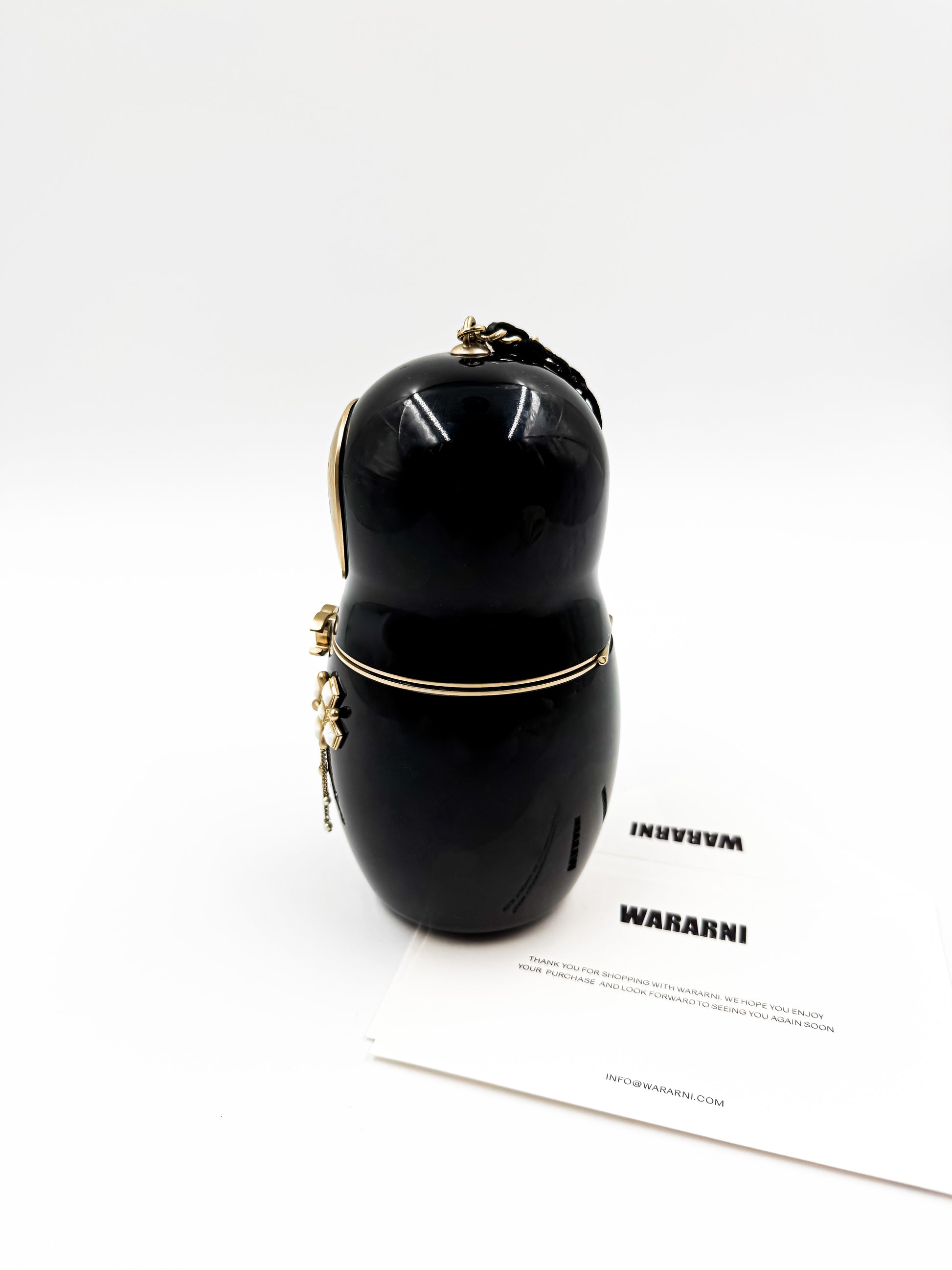 Meticulously sculpted in high-gloss black lucite, the silhouette mirrors the traditional Russian nesting doll—elevated with brushed gold hardware that adds warmth, depth, and modern opulence. The minaudière’s smooth, sculptural form is both whimsical and fiercely luxurious, making it one of Chanel’s most coveted objets d’art.