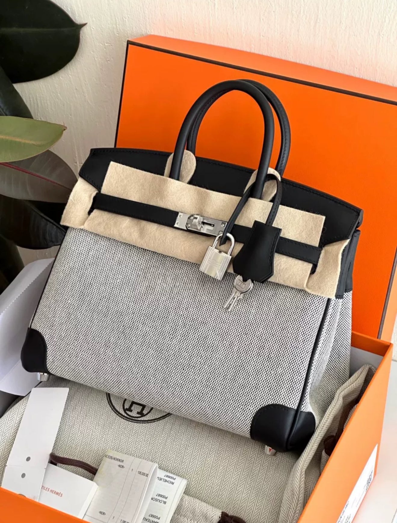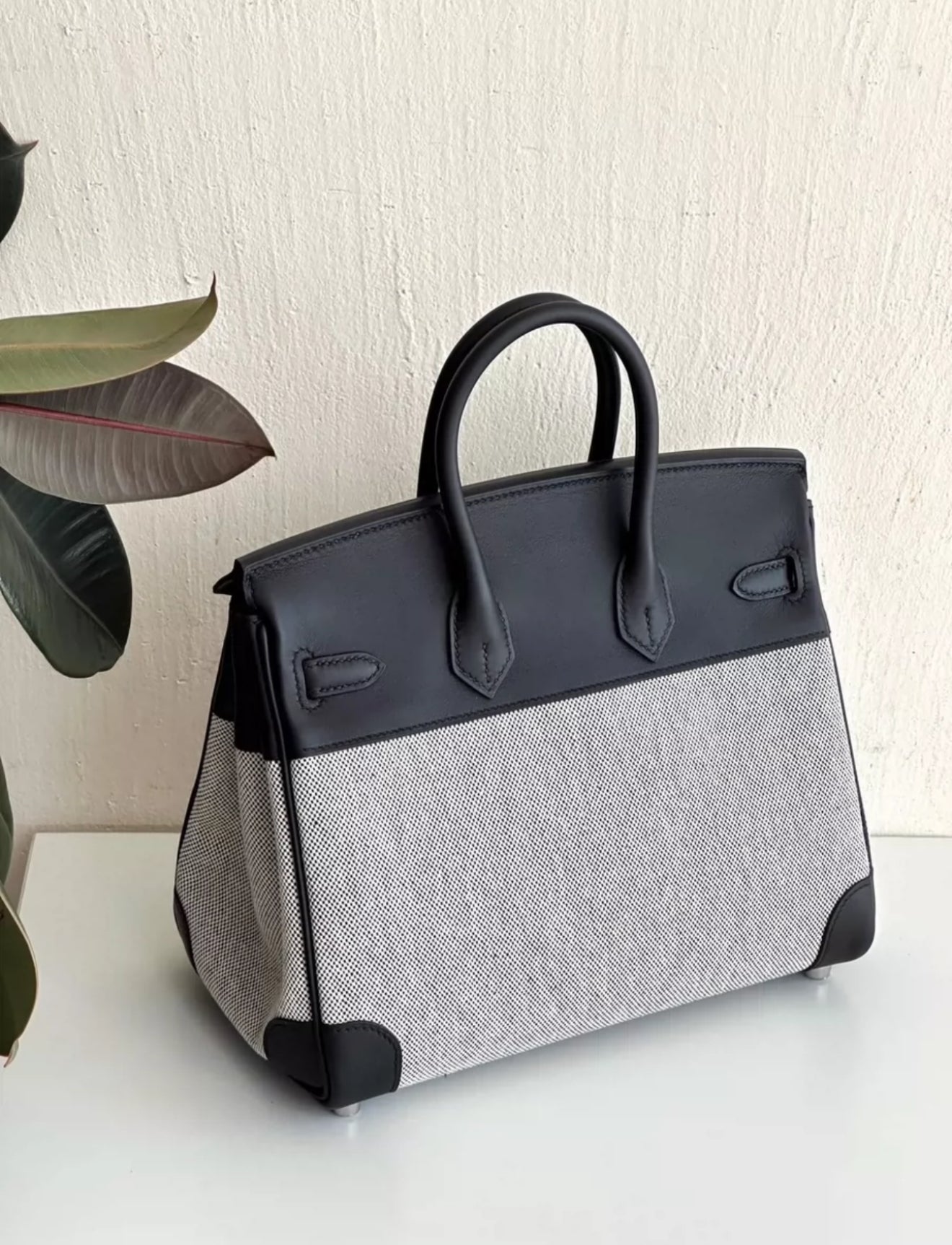 HERMÈS Birkin 25 Quadrille in Black Canvas and Swift leather with Palladium hardware